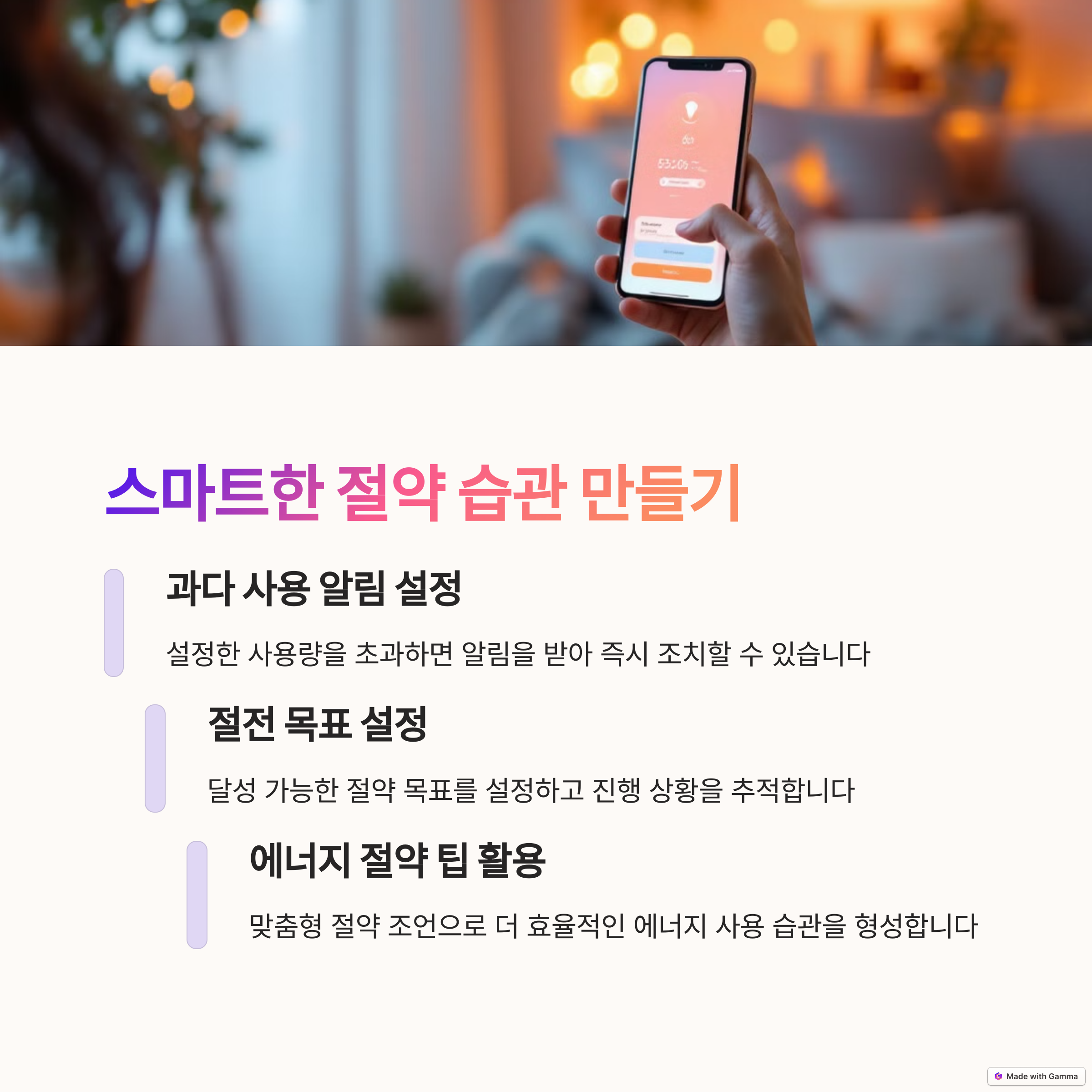 | 눈에 보이지 않는 소비를 막아줌 | 사용량 그래프 제공으로 직관적 확인 | 기술을 접목한 가정 관리 방식 |