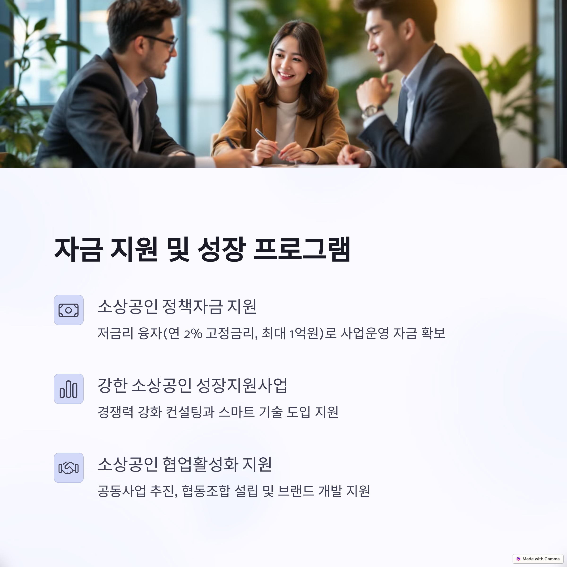 소상공인들이 협업을 통해 경쟁력을 강화할 수 있도록 지원하는 사업입니다. 협동조합 형태로 공동 사업을 추진하면 다양한 지원을 받을 수 있어요. 저도 주변 소상공인들과 함께 협동조합을 설립하여 공동 마케팅을 진행하고 있는데, 이 지원을 통해 큰 도움을 받고 있습니다.