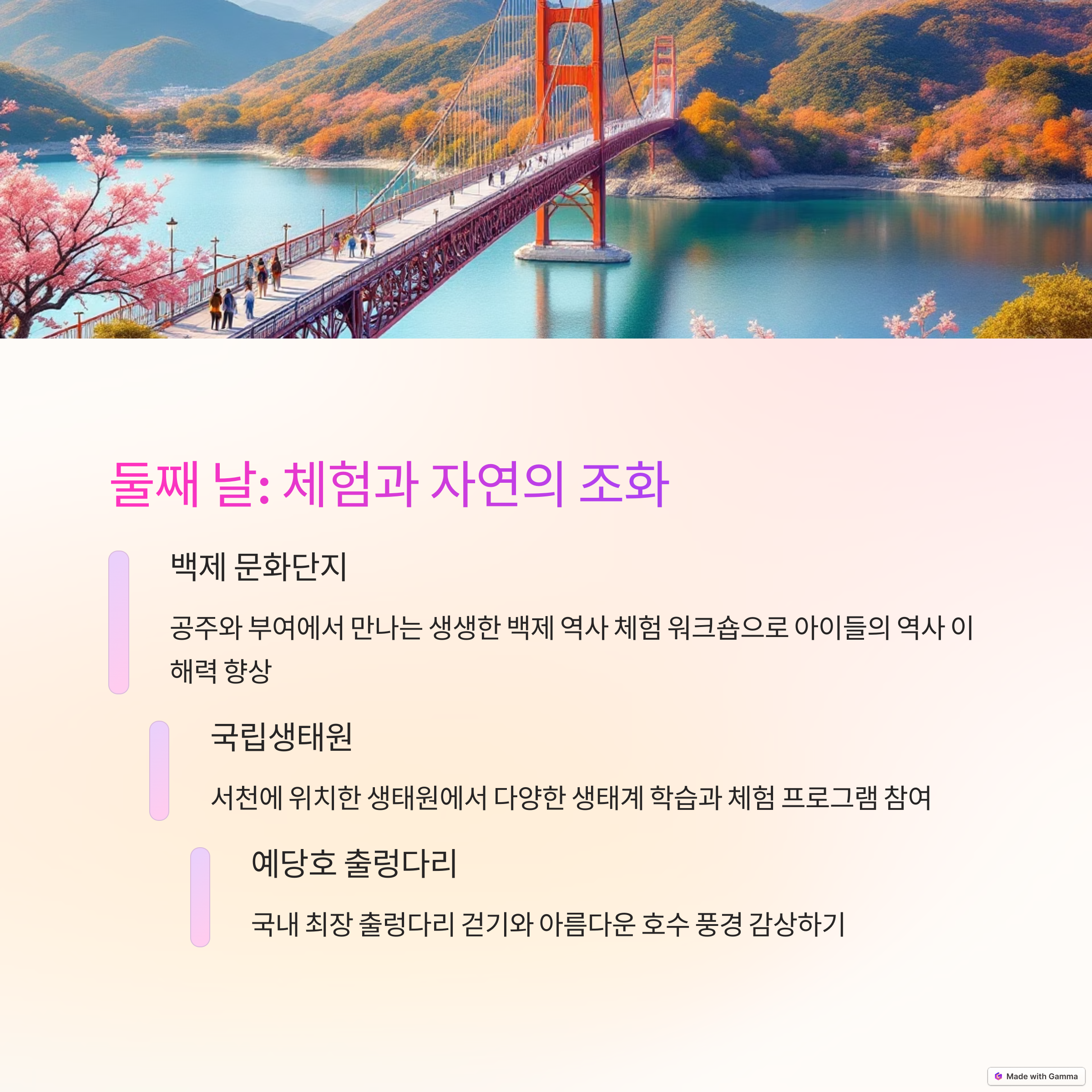충남 북부는 자연과 도시의 장점을 고루 갖춘 매력적인 지역입니다. 특히 아이와 함께 떠나는 주말 여행으로는 거리와 동선, 체험 콘텐츠 모두에서 만족도를 높이기 좋은 곳입니다. 1박 2일이라는 짧은 시간이지만 교육, 휴식, 체험이 모두 가능한 여행을 계획할 수 있는 충남 북부의 코스를 가족과 함께 소중한 추억으로 남겨보시길 바랍니다. 더불어 다양한 지역 음식도 함께 즐긴다면 여행의 풍성함은 배가될 것입니다.
