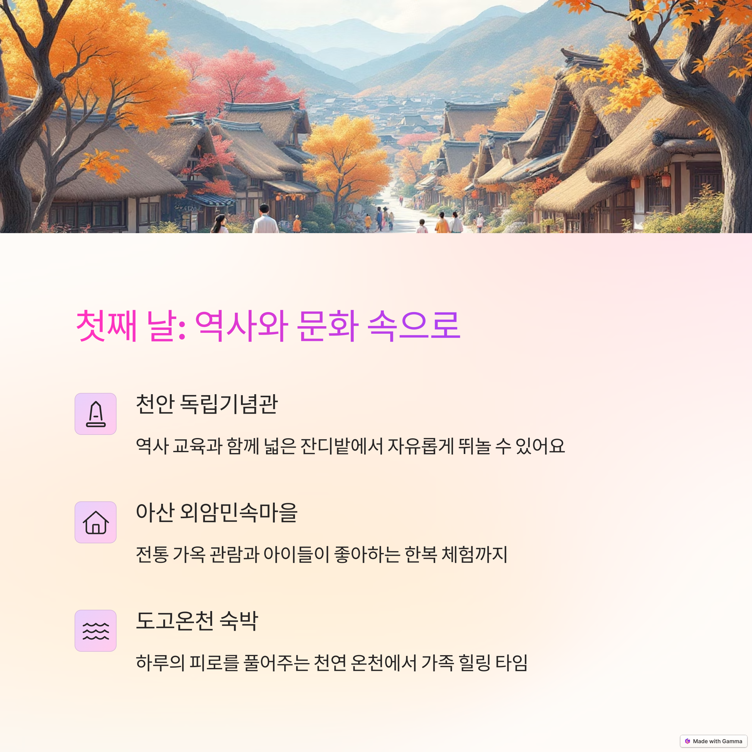 1일 차에는 오전에 천안 독립기념관을 방문해 역사 교육과 놀이를 함께 할 수 있으며, 점심은 천안 병천순대거리에서 지역 음식을 맛본 후, 오후에는 아산 외암민속마을에서 전통문화 체험을 해보는 코스를 추천드립니다. 저녁은 근처 온양온천 일대 숙소에서 여유롭게 보내고, 온천욕을 통해 하루의 피로를 풀 수 있습니다. 이 코스는 아이들에게 유익한 경험을 제공하면서도 부모님들에게도 편안한 일정을 만들어주는 조화로운 구성입니다.