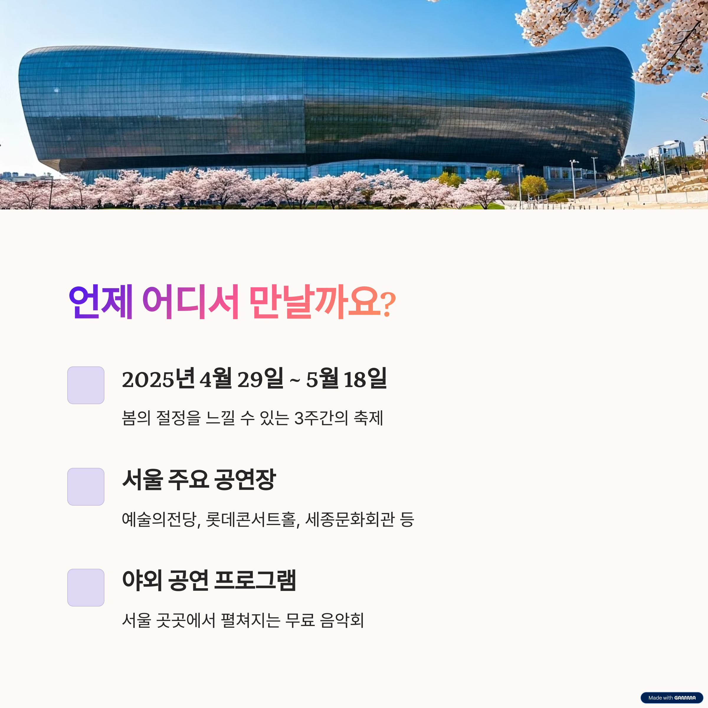 서울스프링페스타는 매년 봄, 서울 전역에서 열리는 클래식 음악 중심의 종합 문화예술 축제입니다.
