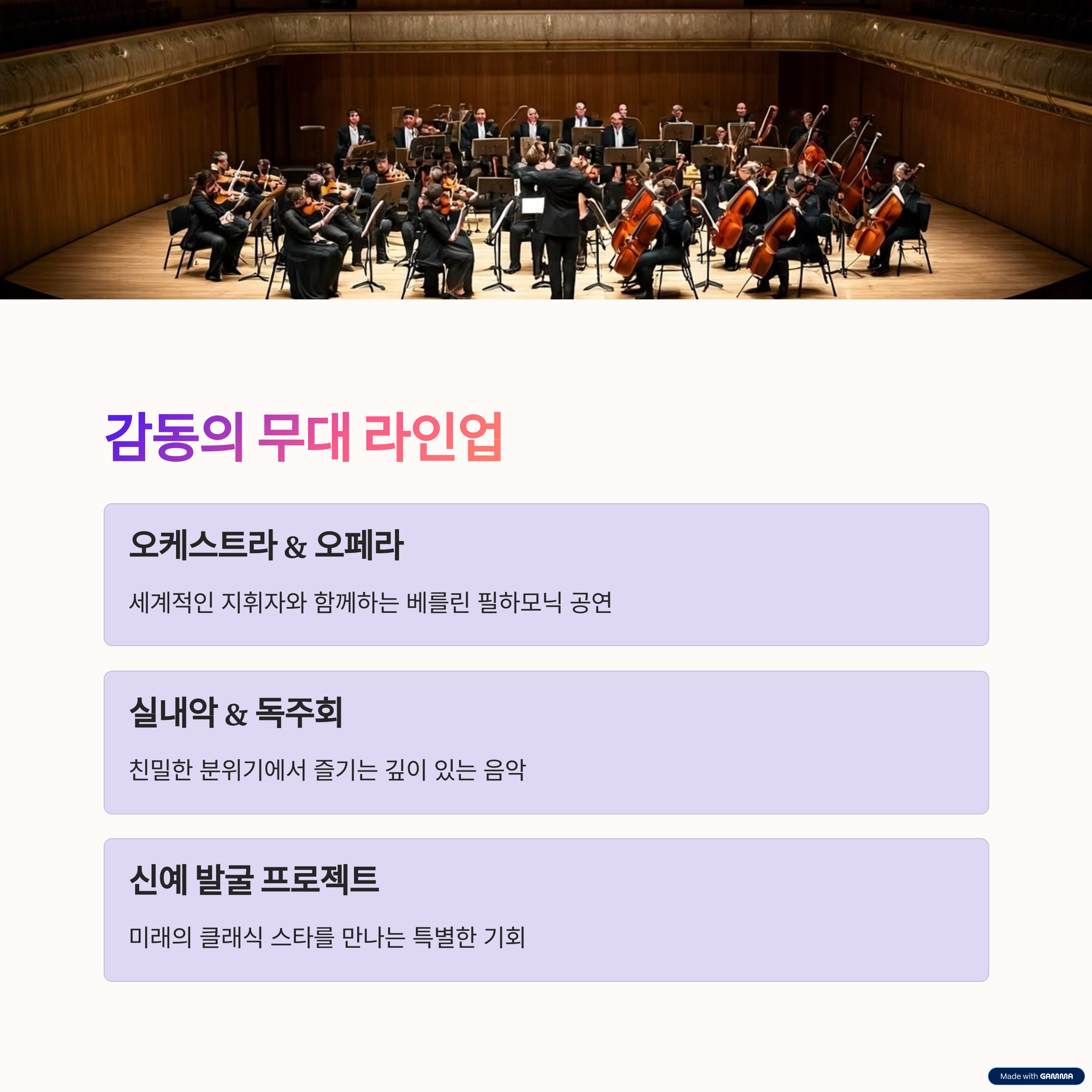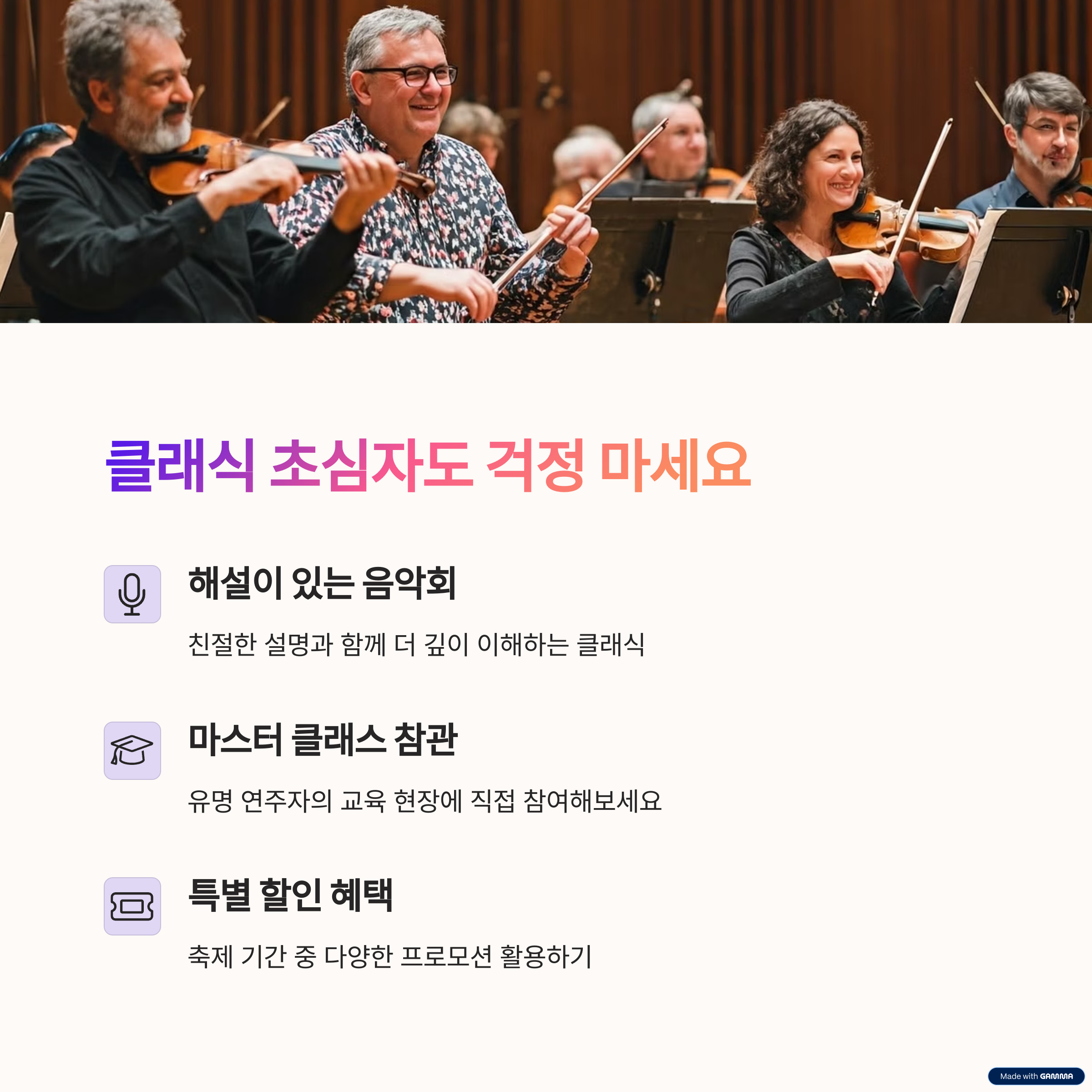 전통과 현대가 어우러진 무대를 통해 누구나 부담 없이 클래식을 즐길 수 있는 기회를 제공합니다.