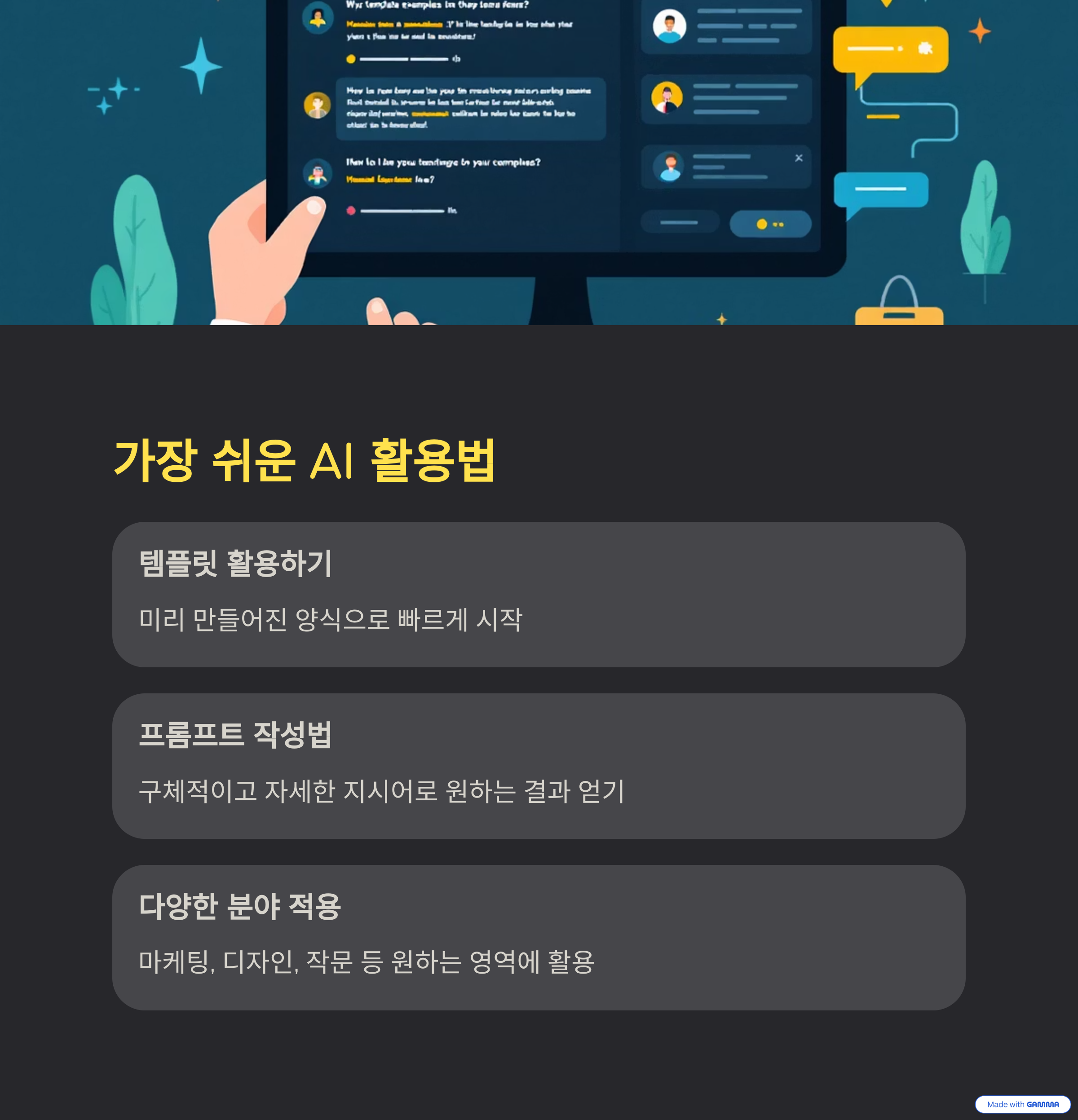 간단한 주제를 잡고 생성형 AI에게 요청해보는 것부터 시작해보세요.