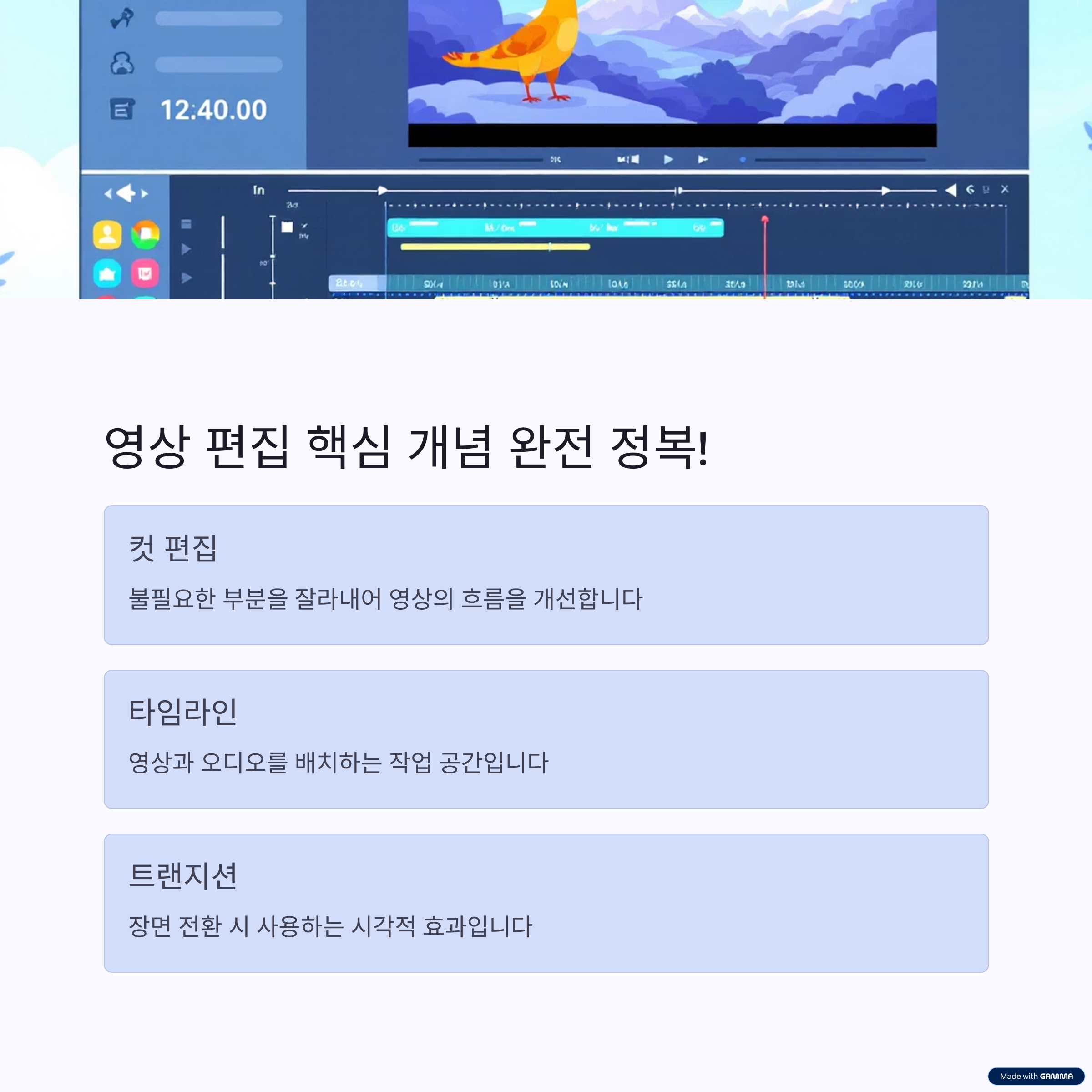 영상 편집은 "촬영된 영상 클립을 연결하고, 다듬어 하나의 스토리로 만드는 작업"입니다.