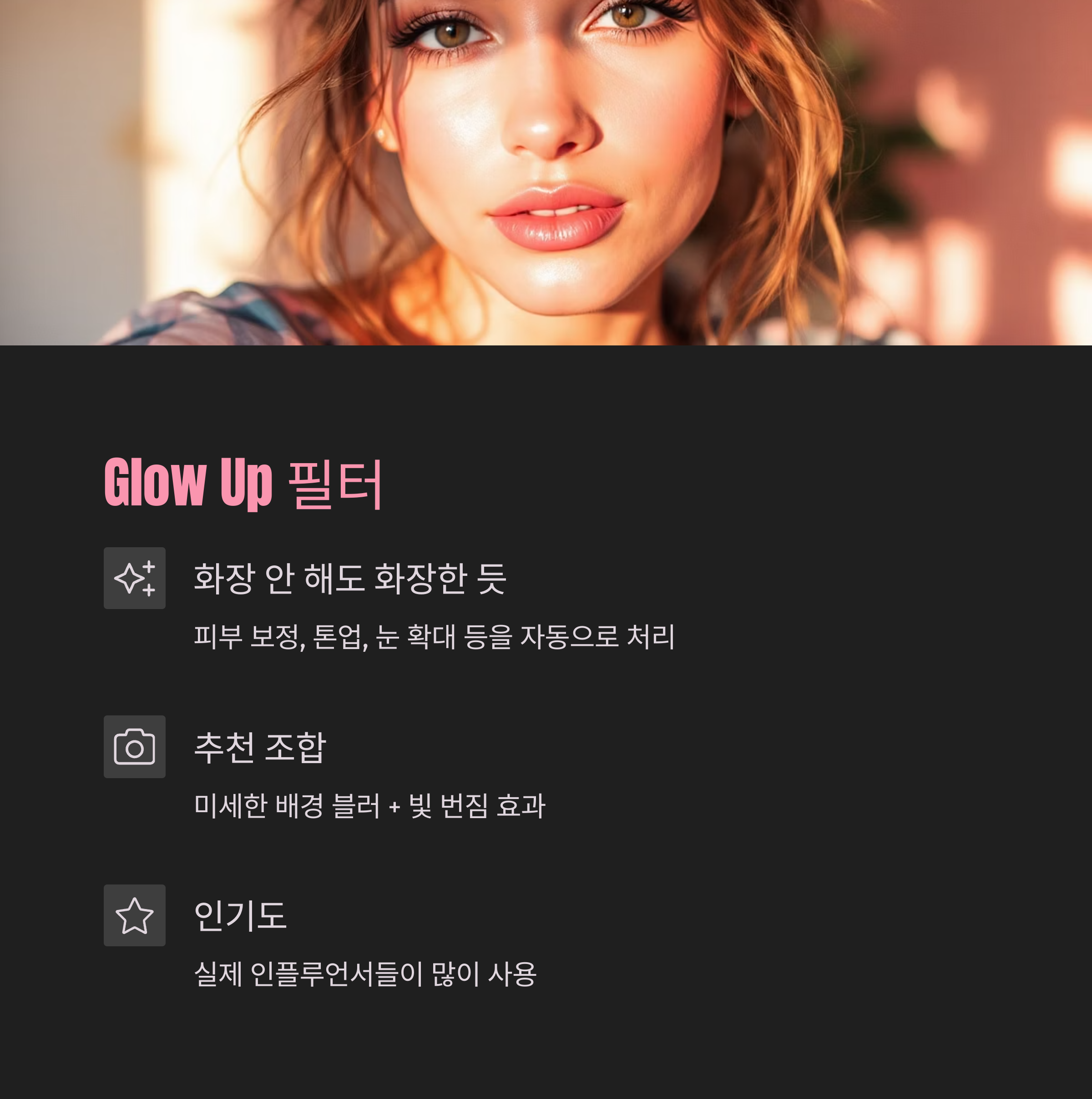 Glow Up 필터는 피부 보정, 톤업, 눈 확대 등을 자동으로 해주며 특히 셀카나 뷰티 콘텐츠에서 인기가 높습니다.