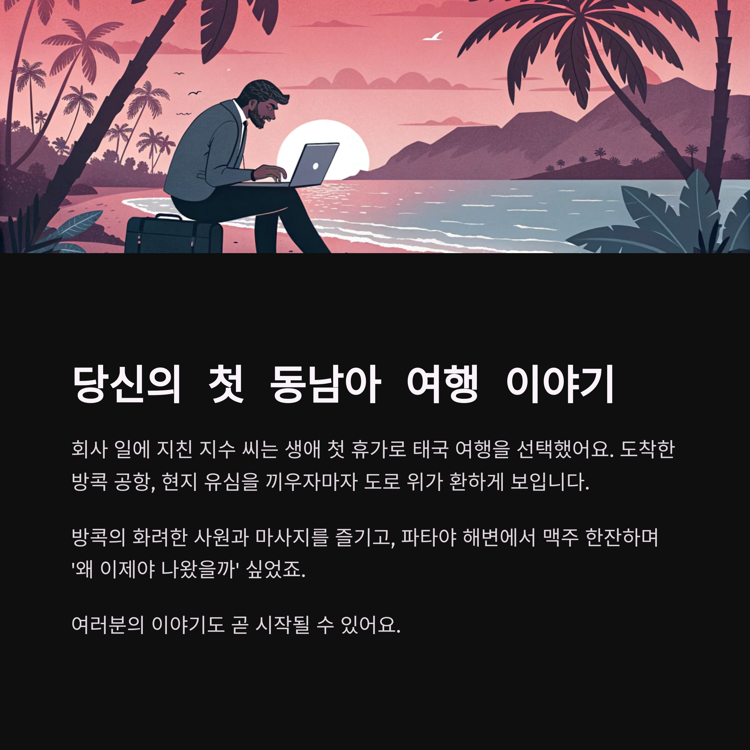 "회사 일에 지친 지수 씨는 생애 첫 휴가로 태국 여행을 선택했어요.