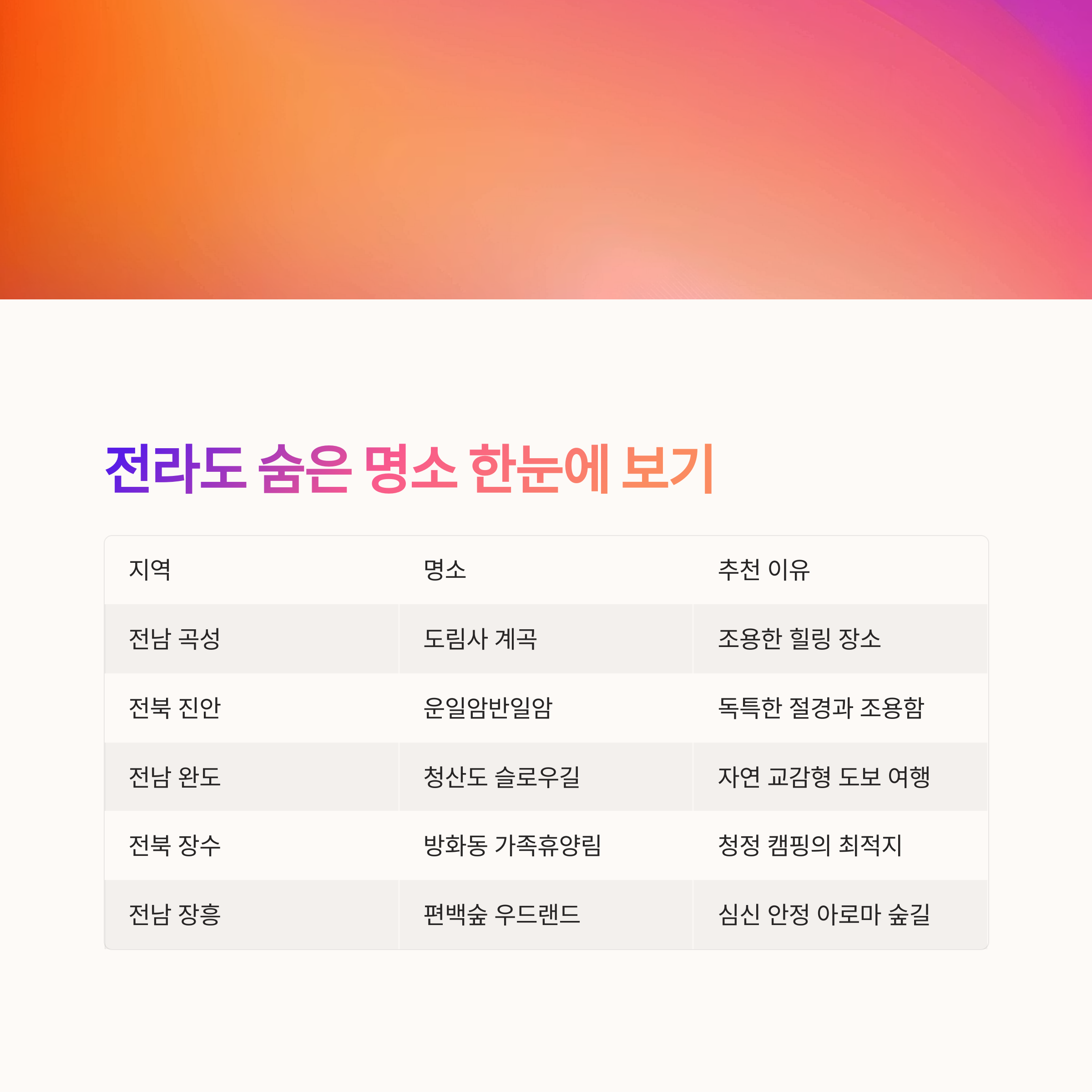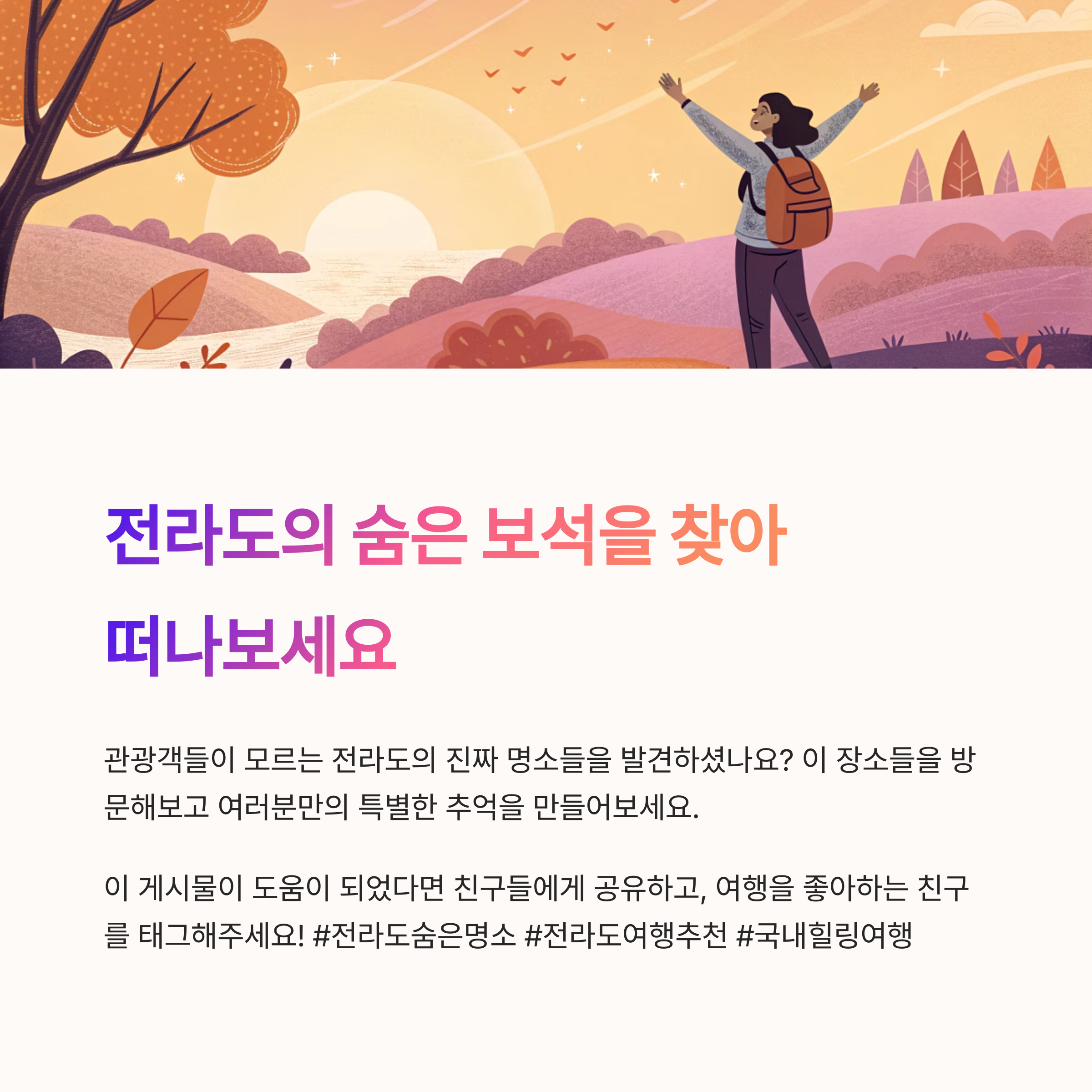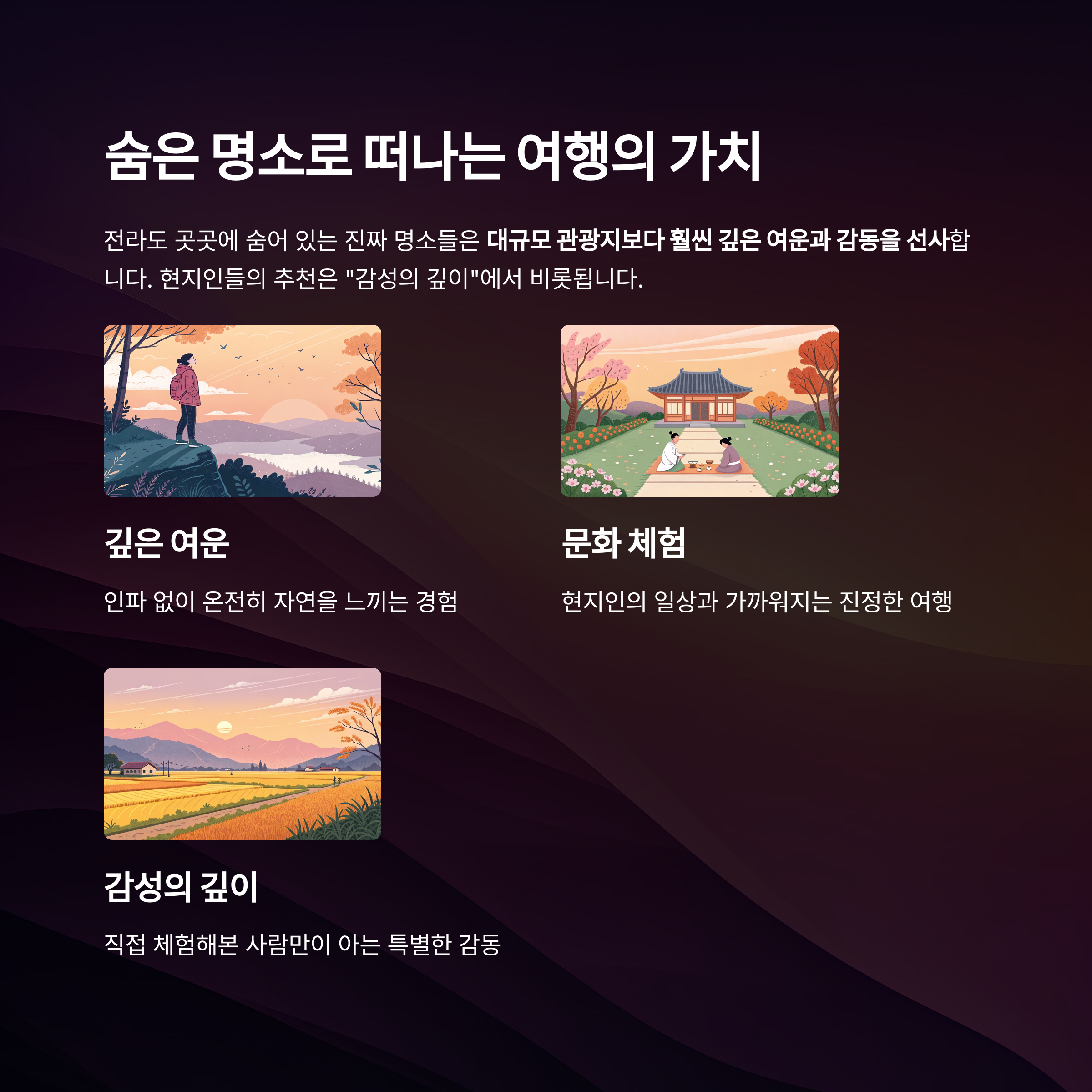 전라도는 자연의 풍경과 전통 문화가 어우러진 여행지로 잘 알려져 있지만, 여전히 **관광객들에게 많이 알려지지 않은 '현지인 추천 명소'**들이 존재합니다.