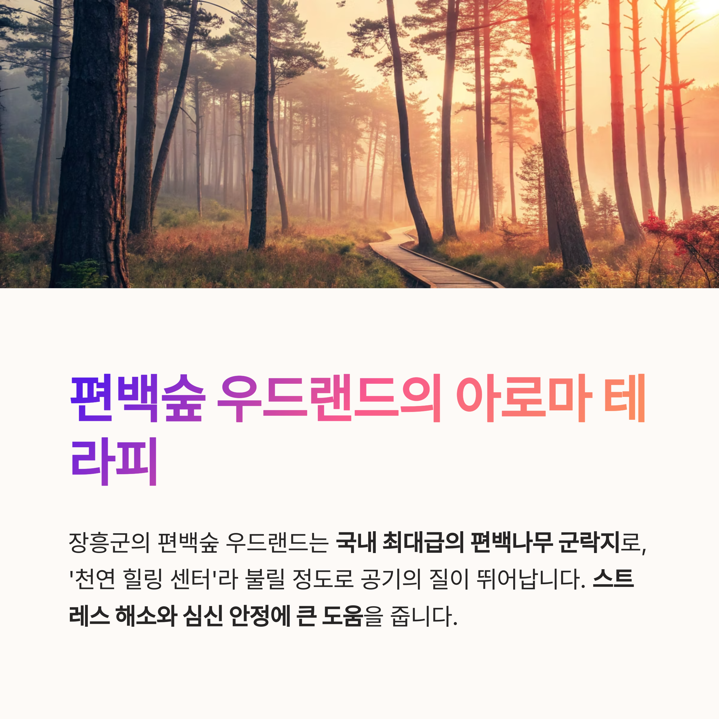 장흥군의 편백숲 우드랜드는 국내 최대급의 편백나무 군락지로, '천연 힐링 센터'라 불릴 정도로 공기의 질이 뛰어납니다.