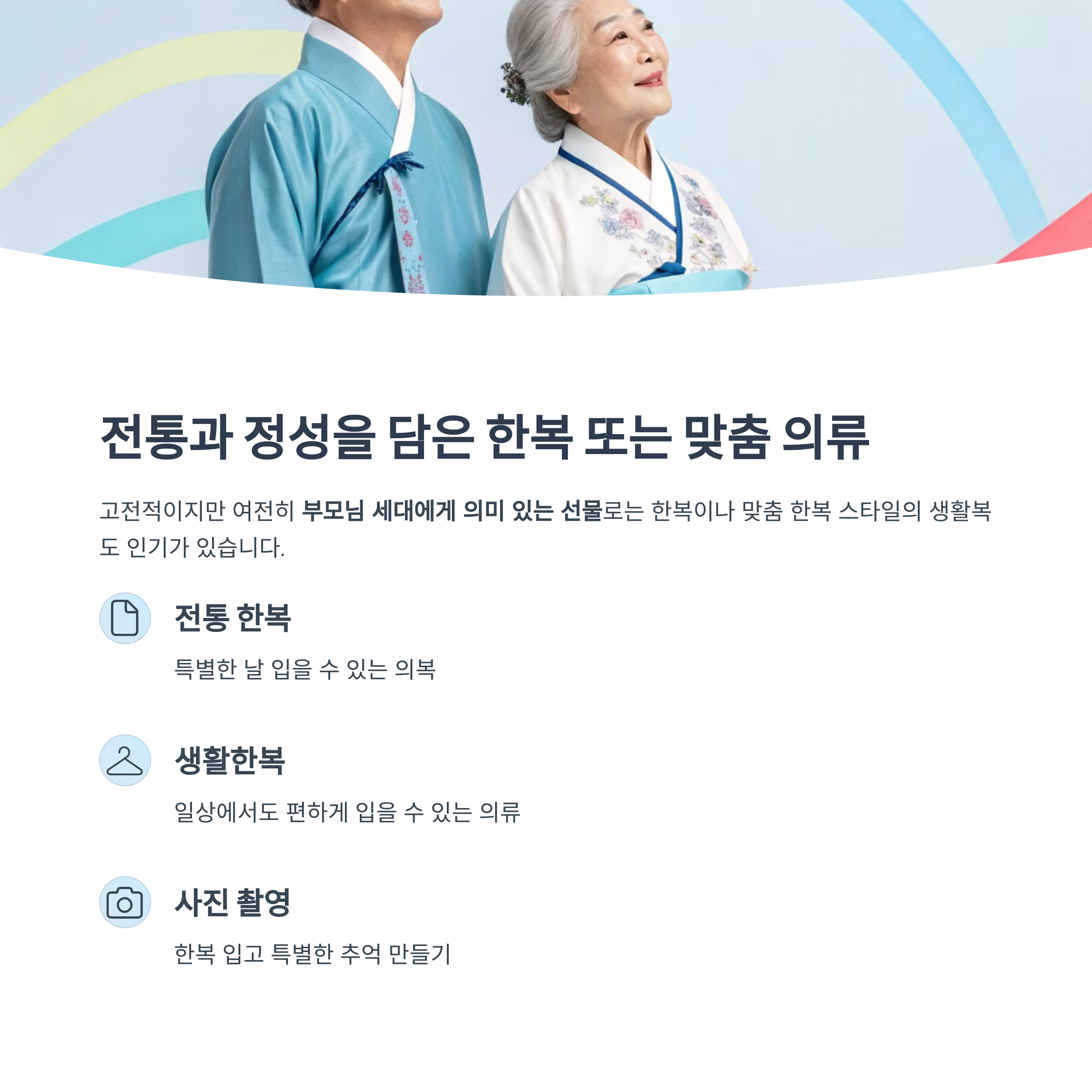 고전적이지만 여전히 부모님 세대에게 의미 있는 선물로는 한복이나 맞춤 한복 스타일의 생활복도 인기가 있습니다.