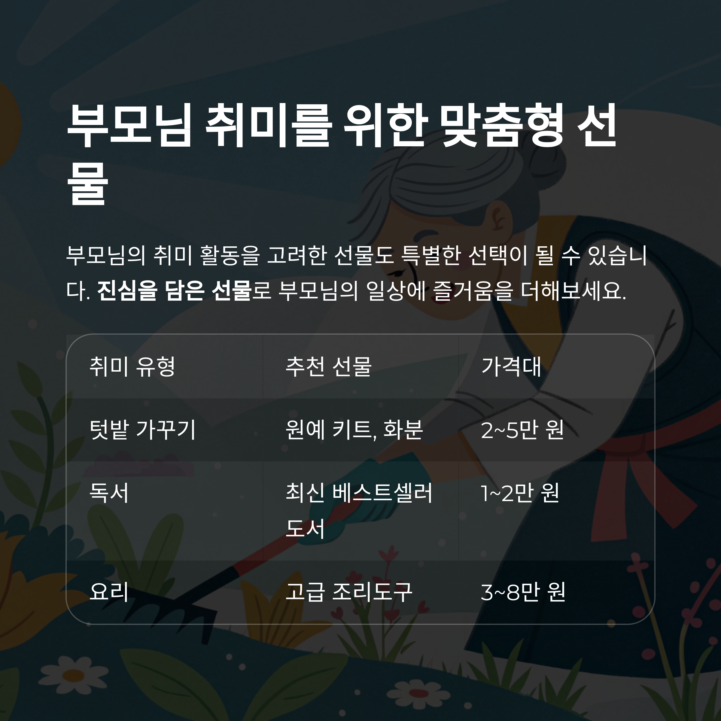 부모님의 취향과 상황에 맞춘 선물을 고르는 데 도움이 될 것입니다.