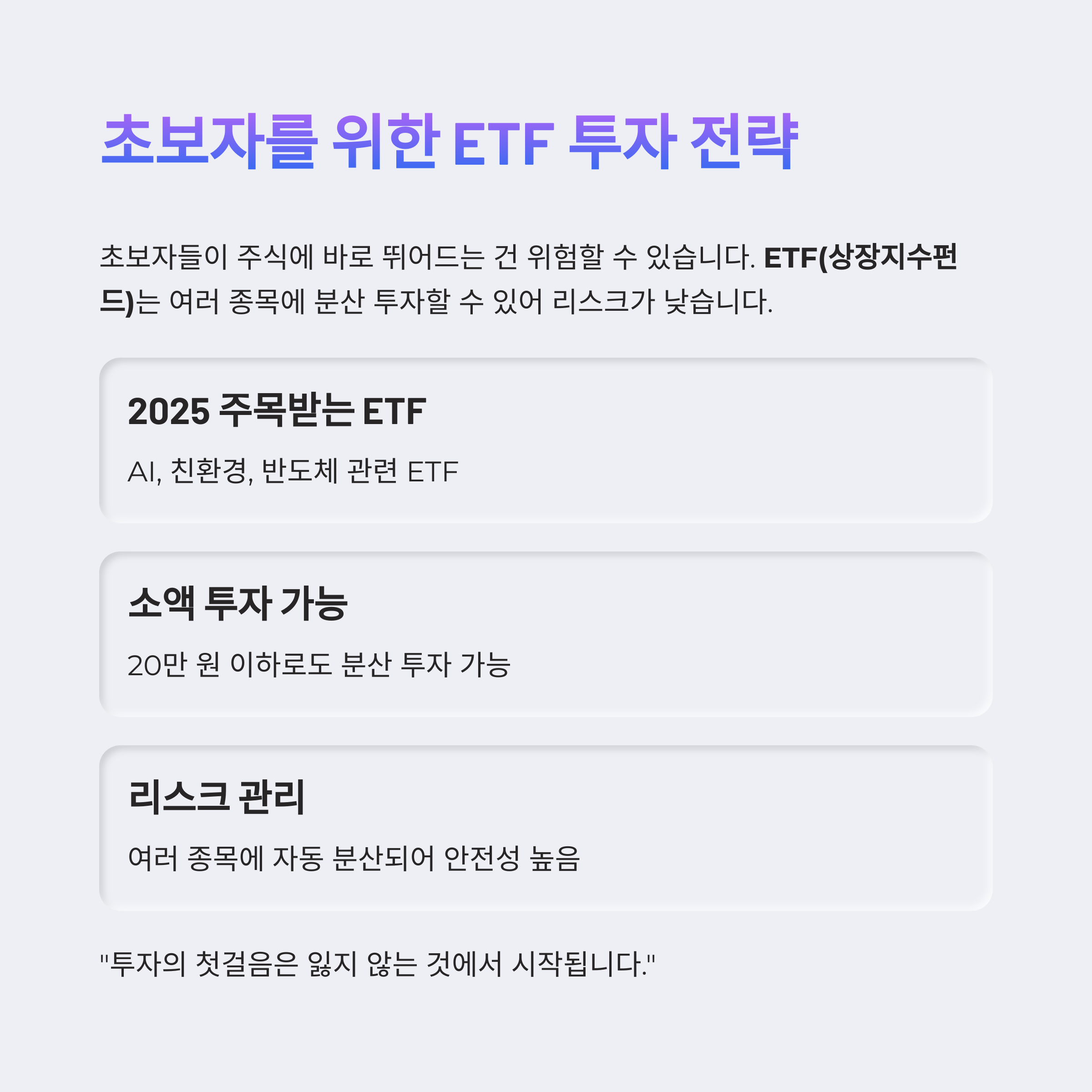**ETF(상장지수펀드)**는 여러 종목에 분산 투자할 수 있어 리스크가 낮습니다.