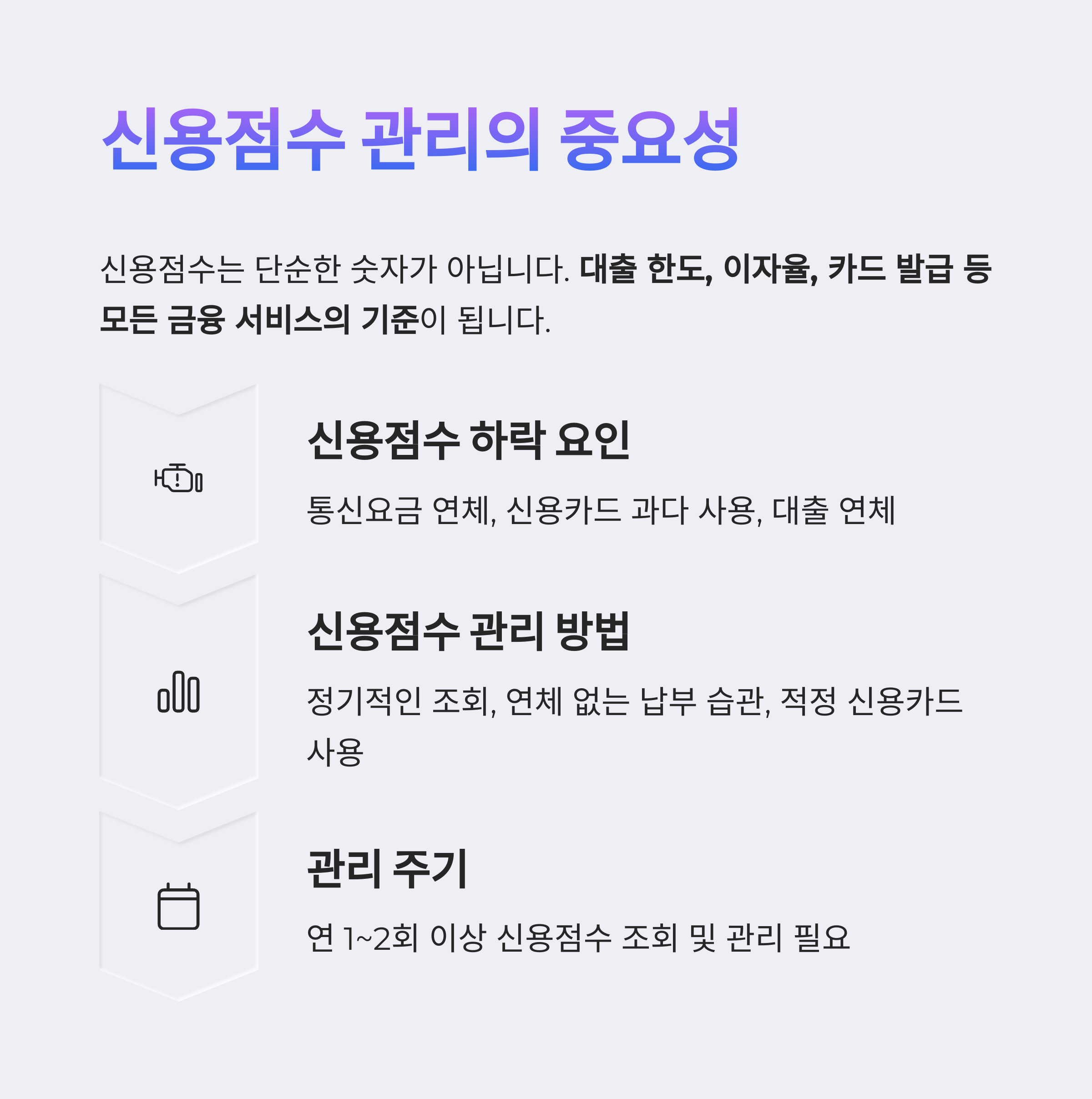 신용점수는 꾸준한 관리가 필요하며, 연 1~2회 이상 조회해보는 것이 좋습니다.
