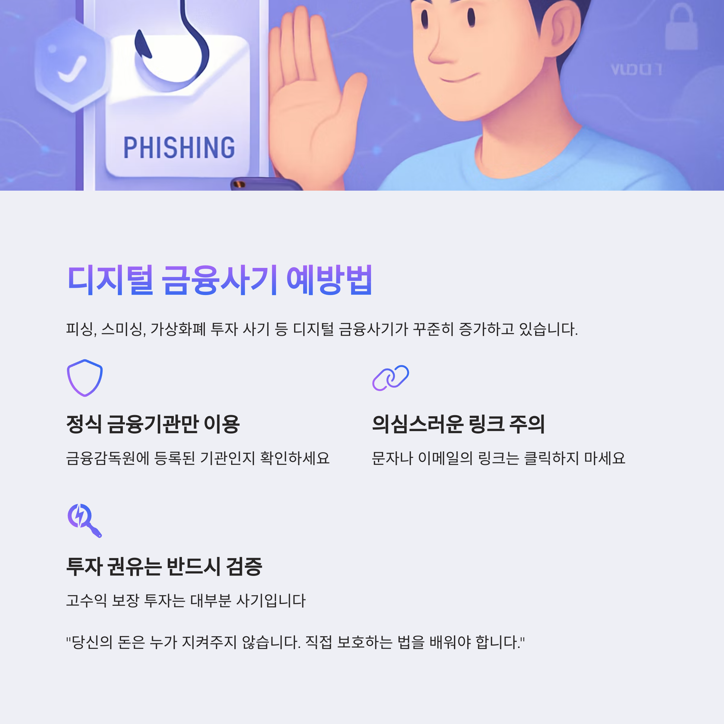 피싱, 스미싱, 가상화폐 투자 사기 등 디지털 금융사기가 꾸준히 증가하고 있습니다.