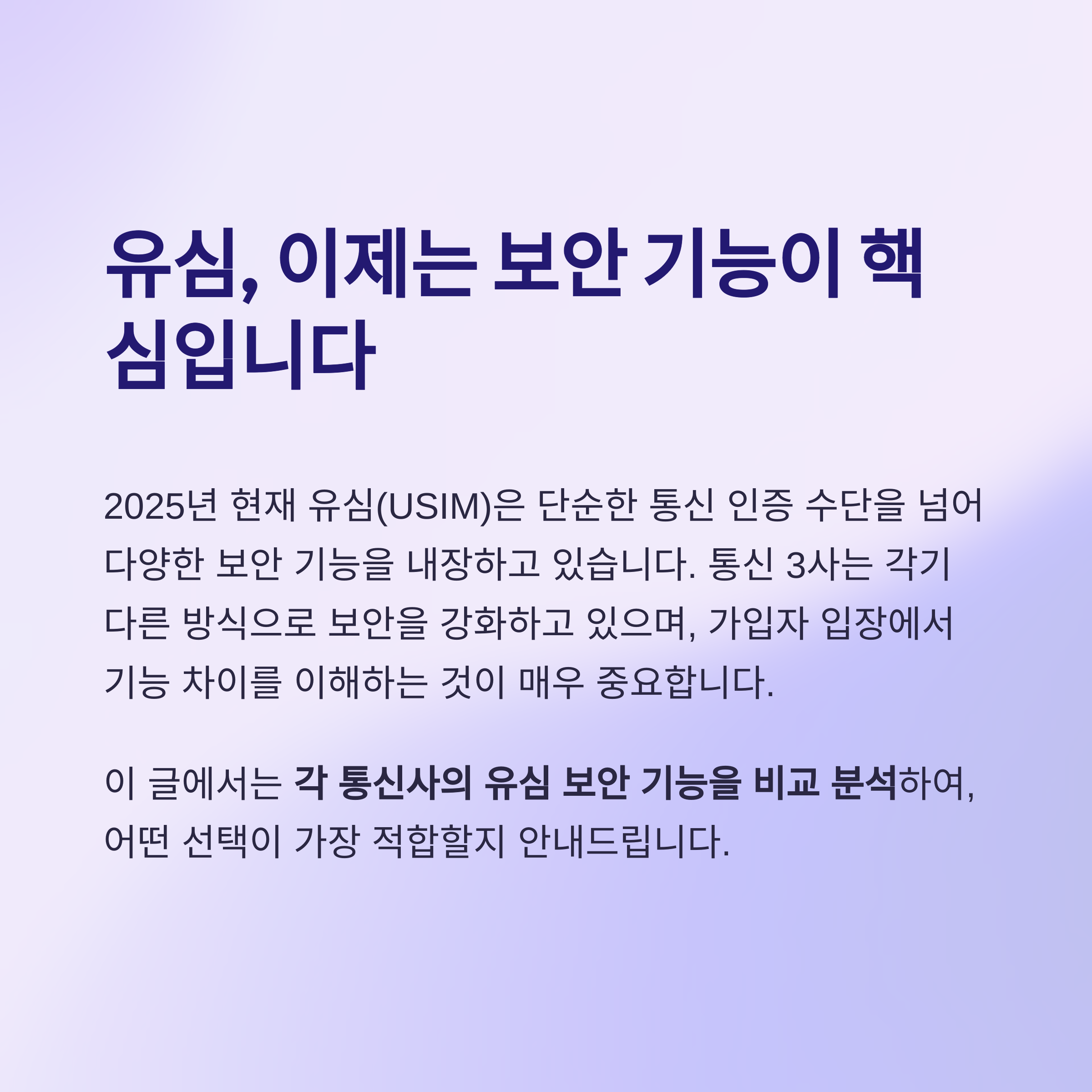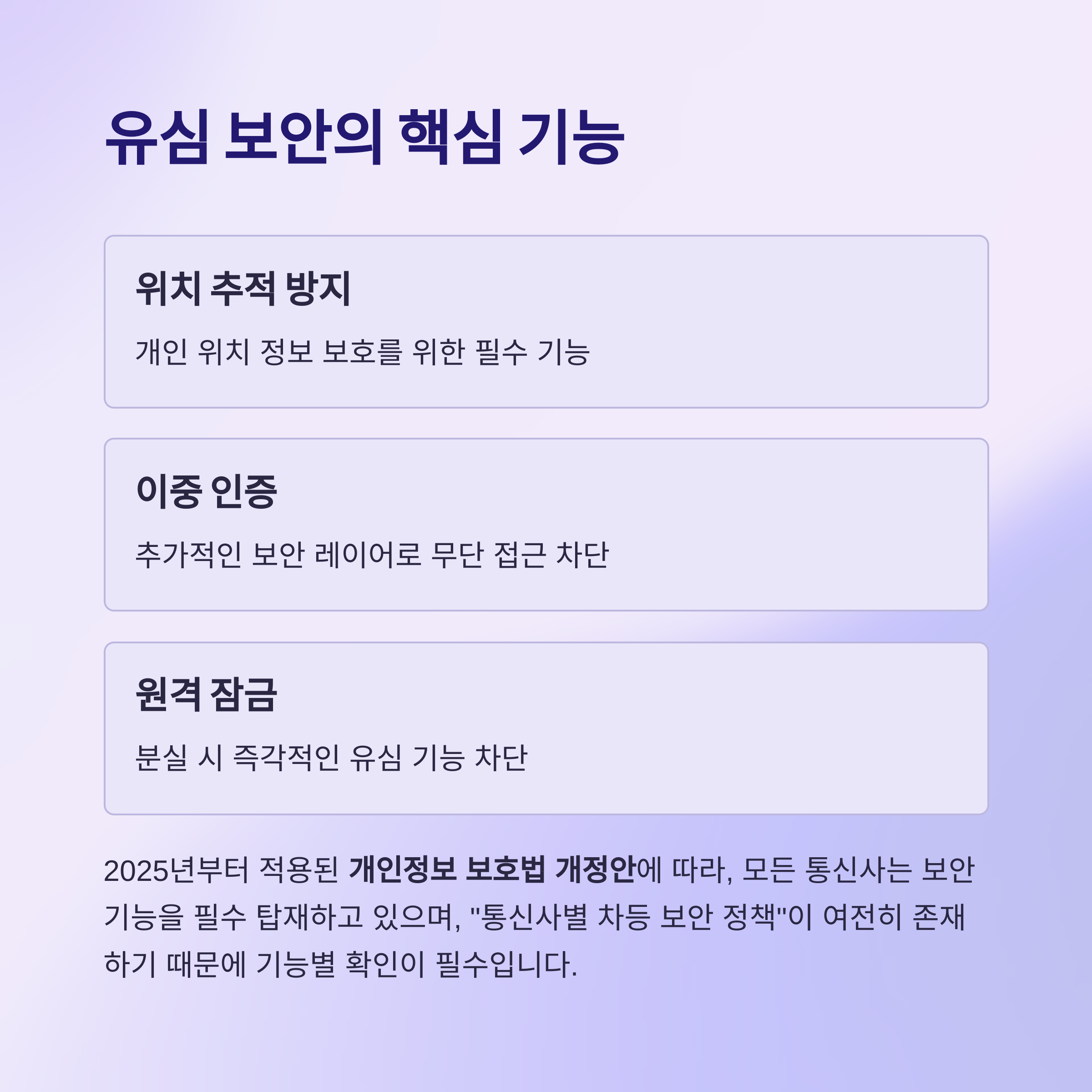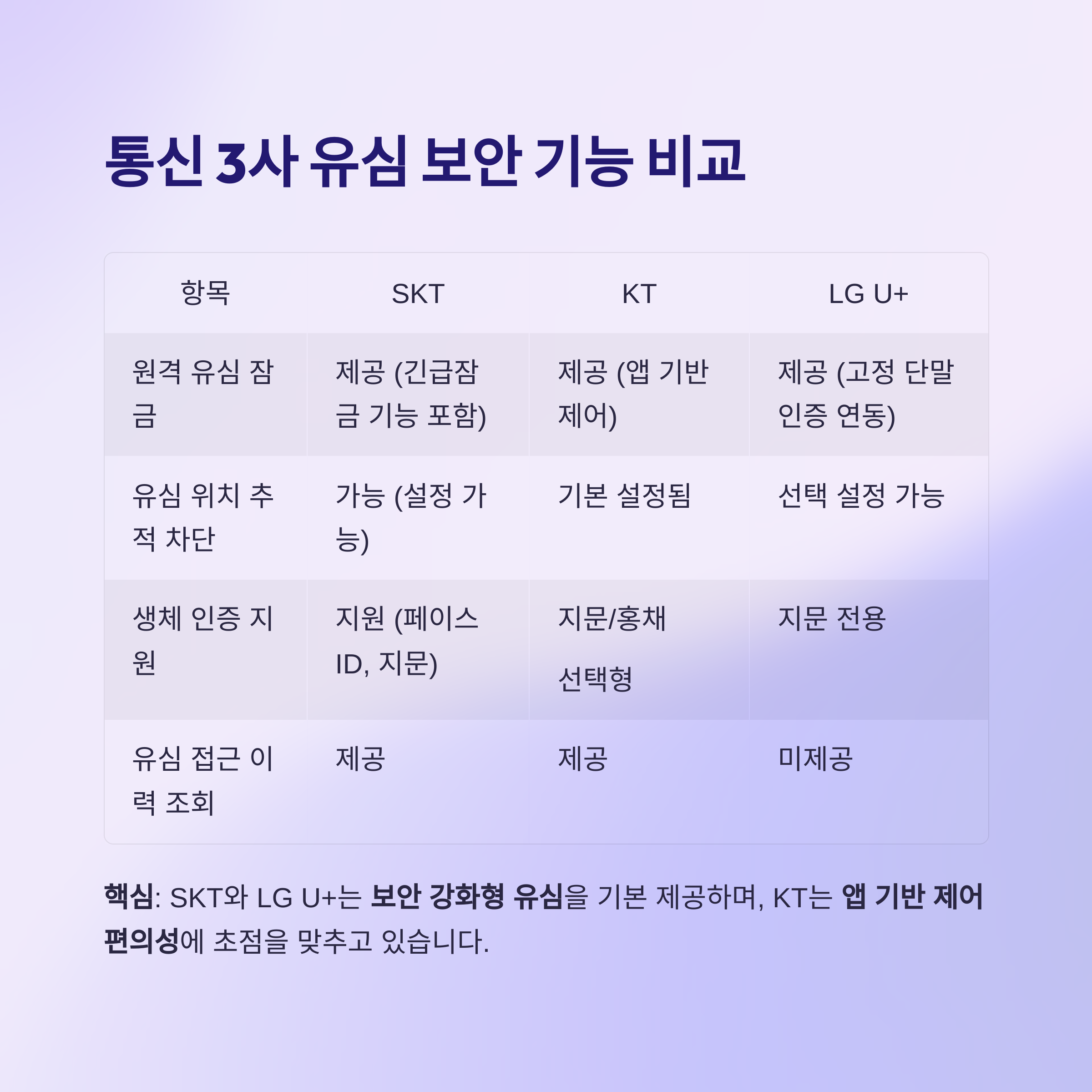 핵심: SKT와 LG U+는 보안 강화형 유심을 기본 제공하며, KT는 앱 기반 제어 편의성에 초점을 맞추고 있습니다.