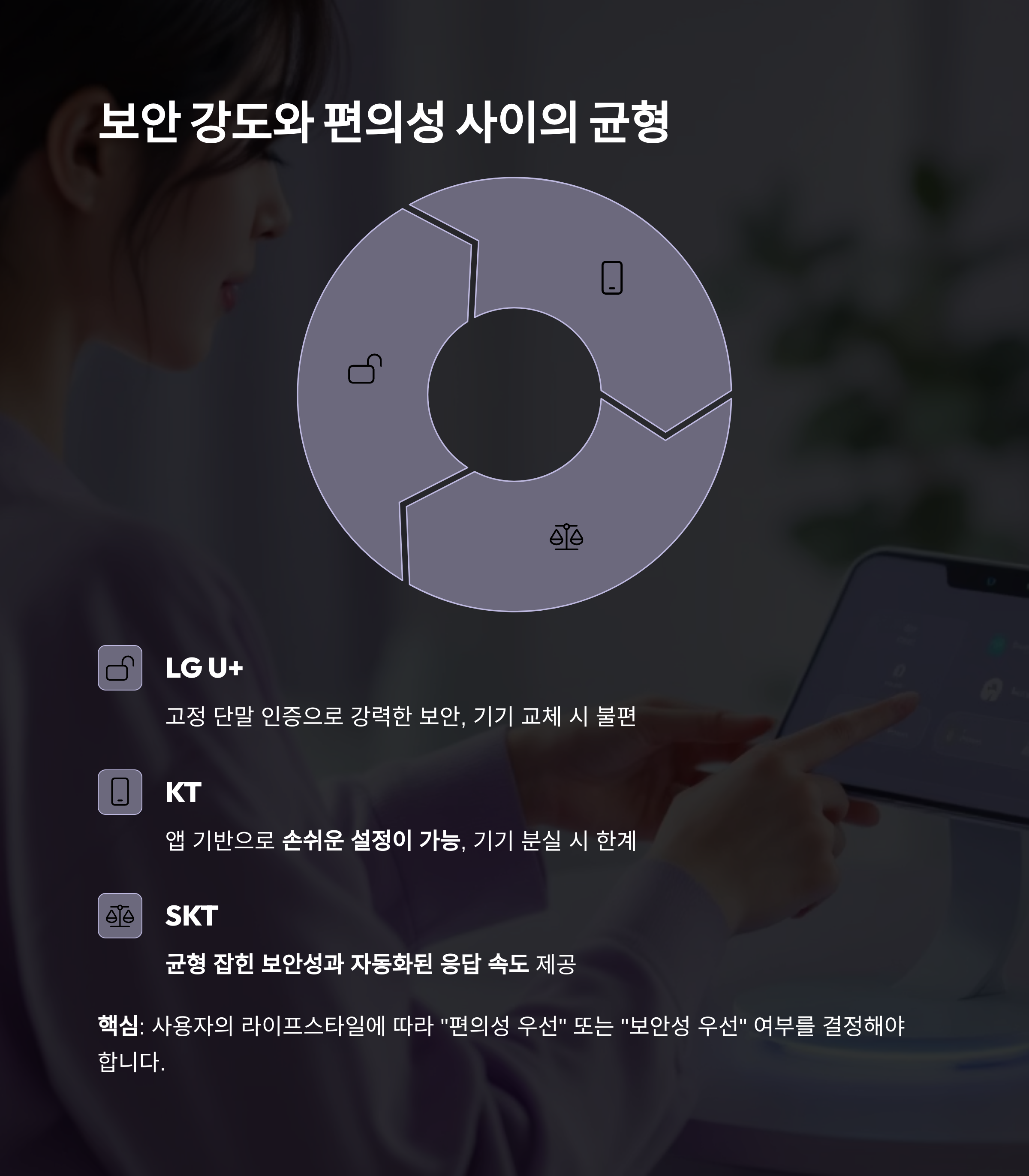 "보안이 생명인 비즈니스 사용자라면 LG U+, 가정용 사용자는 SKT의 자동화 기능, 편리함을 중시한다면 KT가 적합합니다."