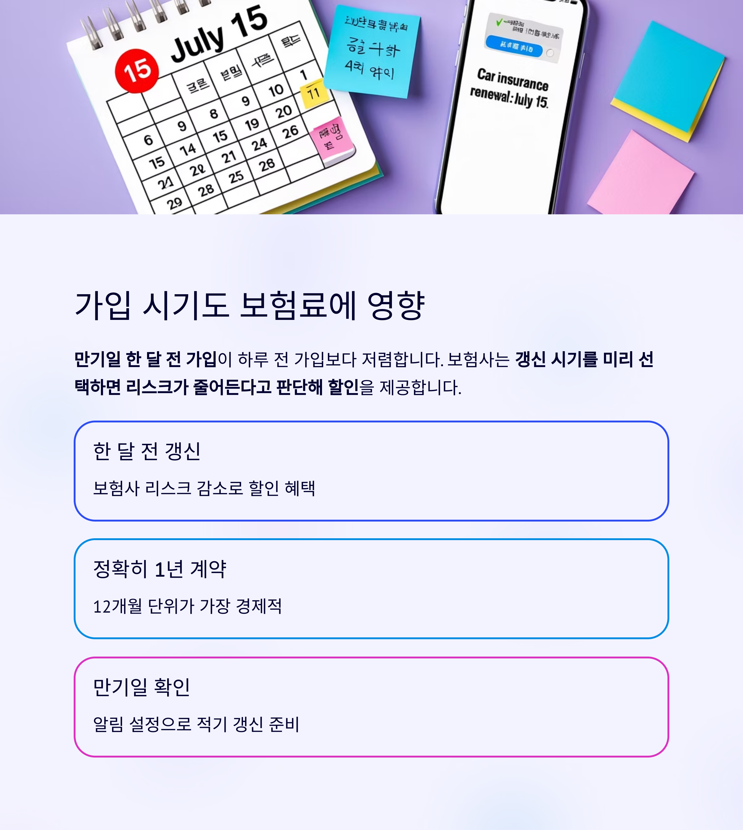 또한 12개월보다 짧거나 긴 계약은 보험료가 높아질 수 있으니, 정확히 1년 단위로 계약하는 것이 가장 경제적입니다.