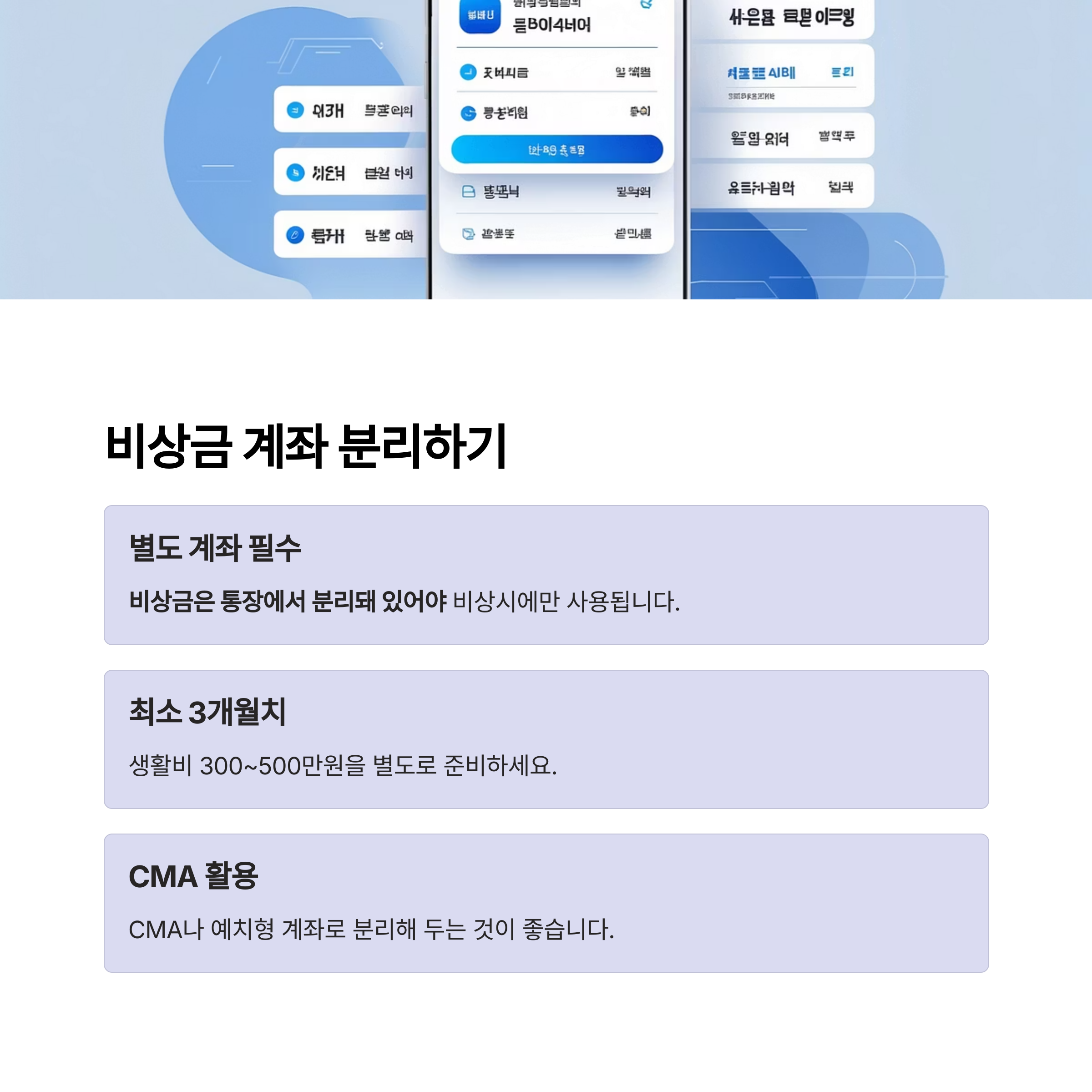 최소 3개월치 생활비(보통 300~500만 원)를 CMA나 별도 예치형 계좌로 분리해 두는 것을 추천합니다.