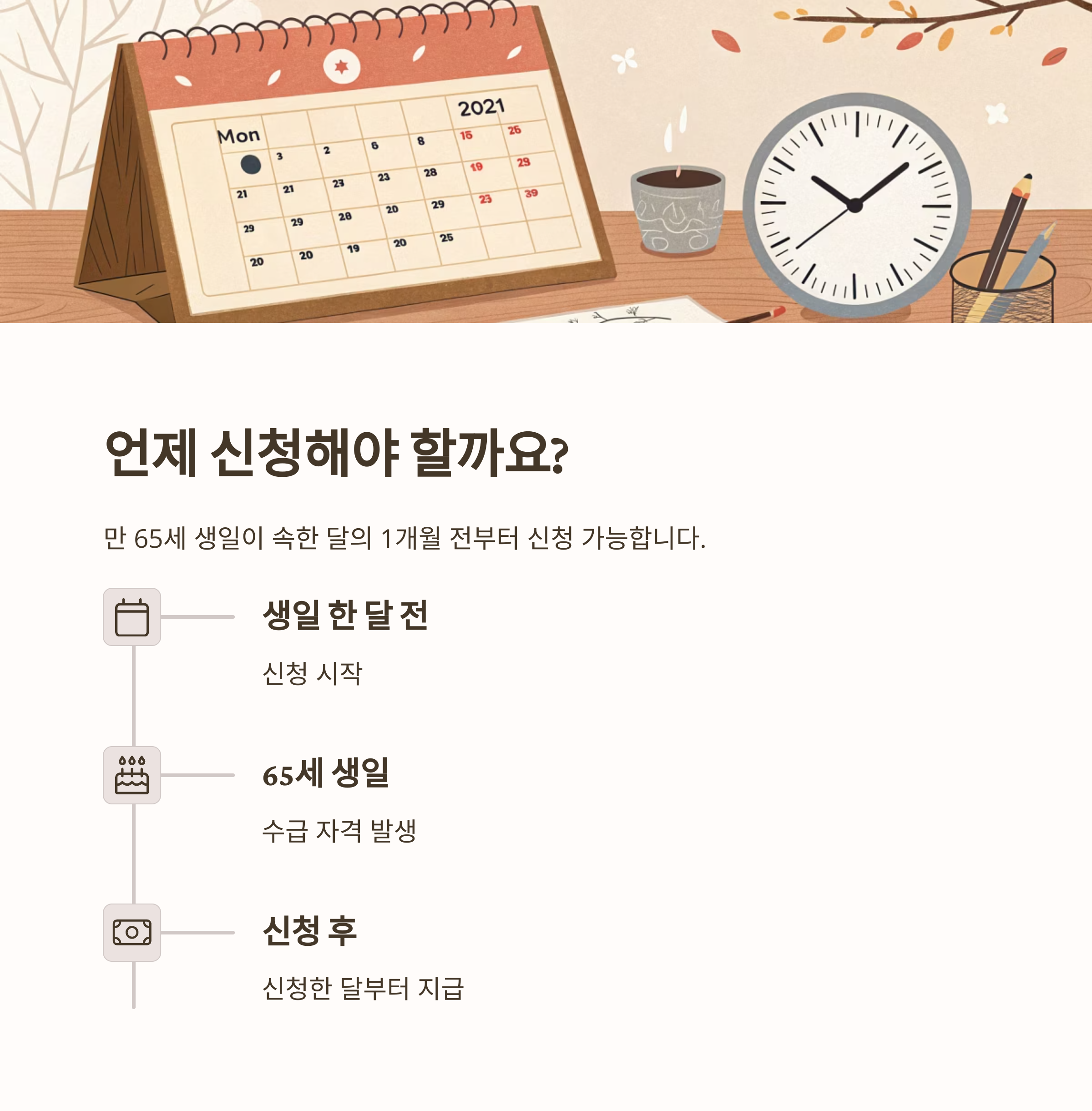 만 65세 생일이 속한 달의 1개월 전부터 신청 가능하며