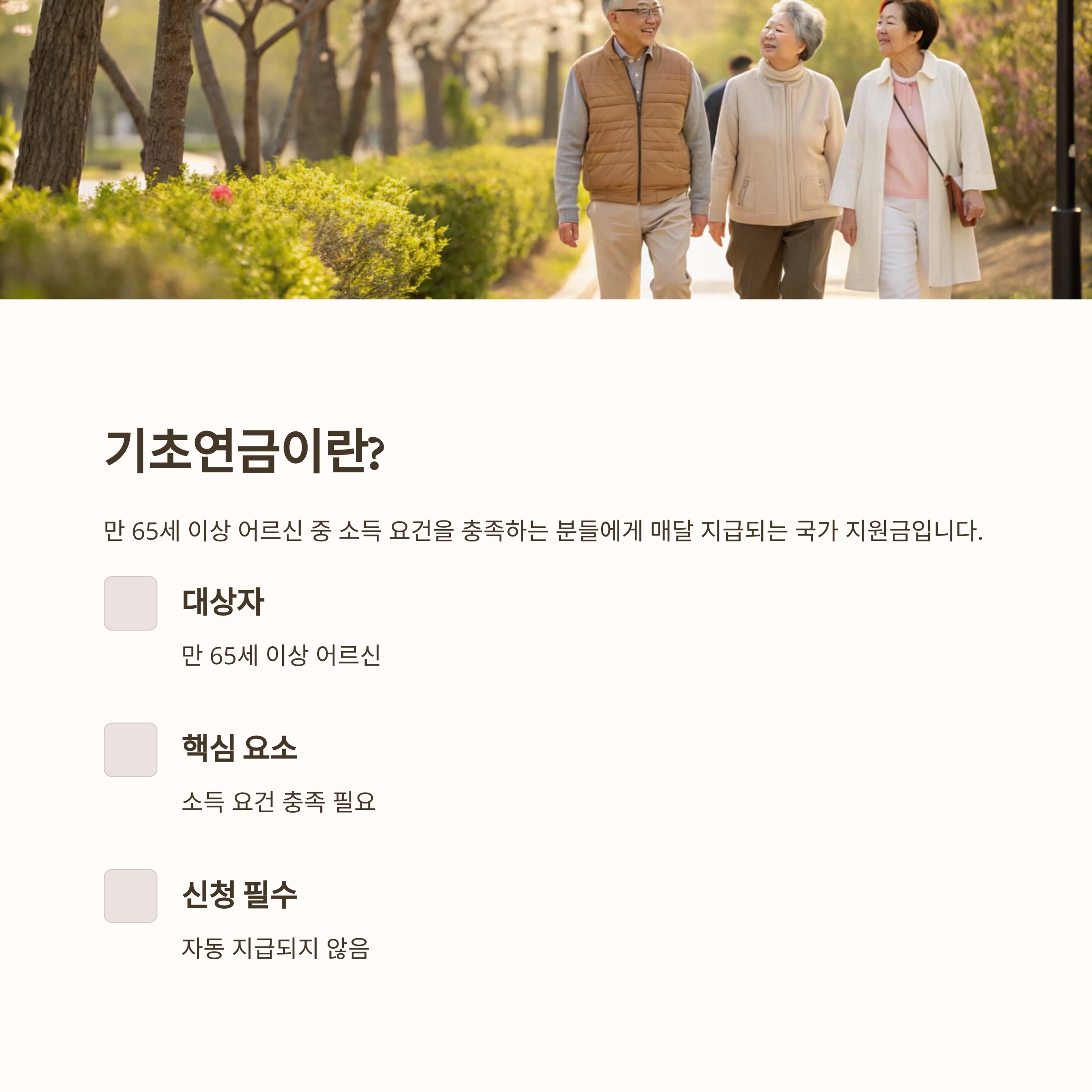 | 대상 | 만 65세 이상, 소득인정액 기준 충족 |
