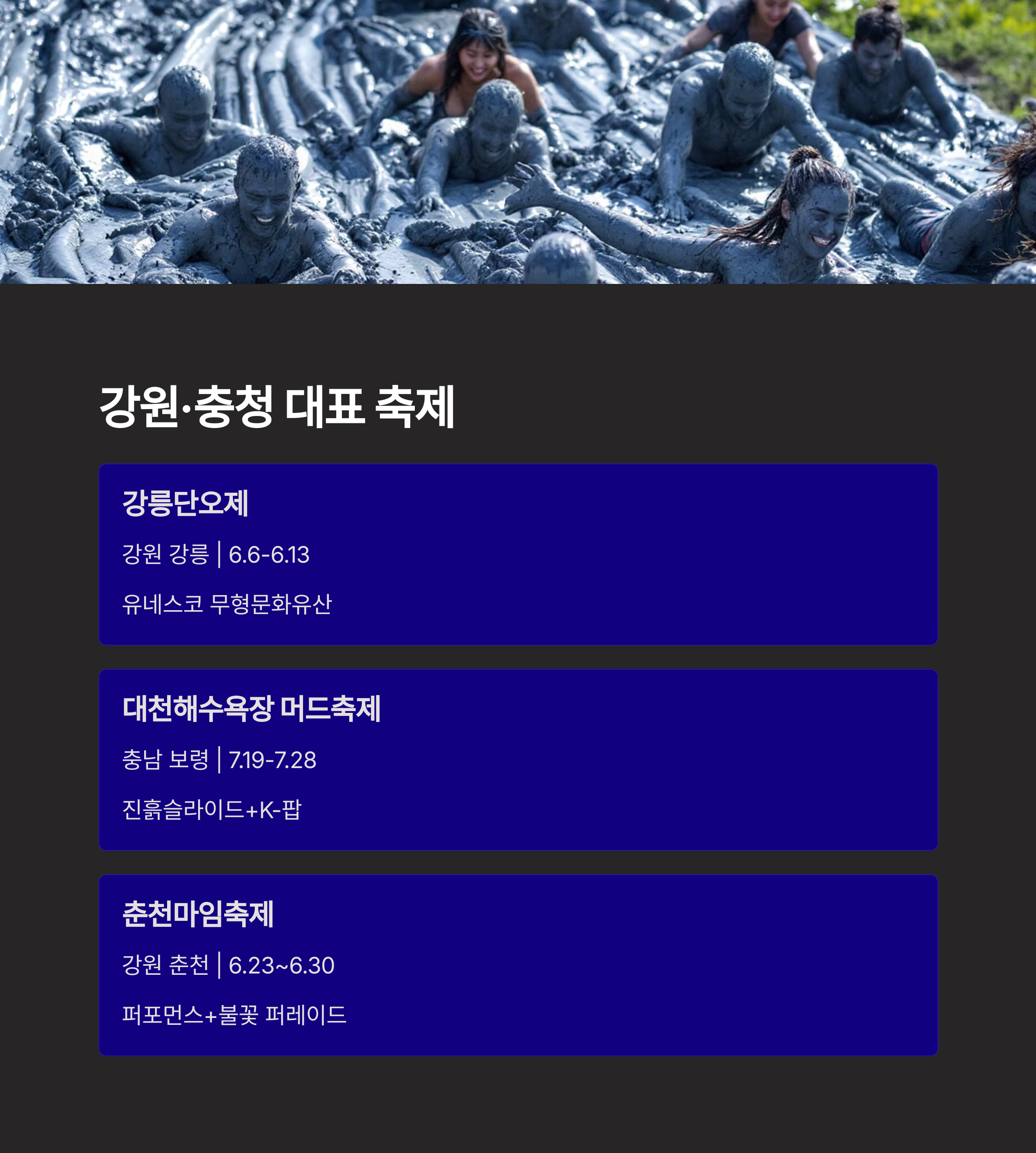 | 대천해수욕장 머드축제 | 충남 보령 | 7.19~7.28 | 진흙슬라이드+K-팝 |