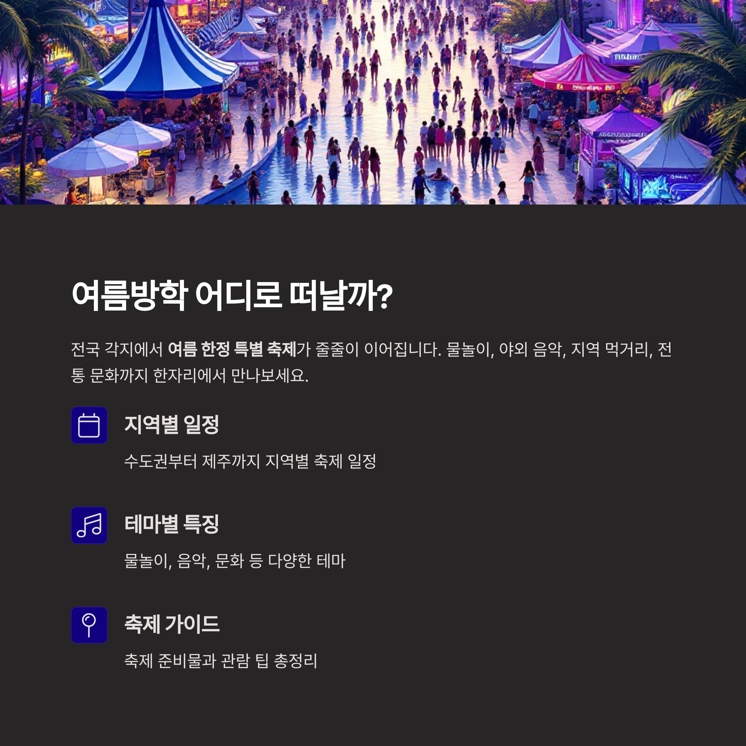 2025 지역별 여름 축제 총정리해보았습니다. 다가오는 여름 즐겁고 신나는 축제를 즐겨보세요!