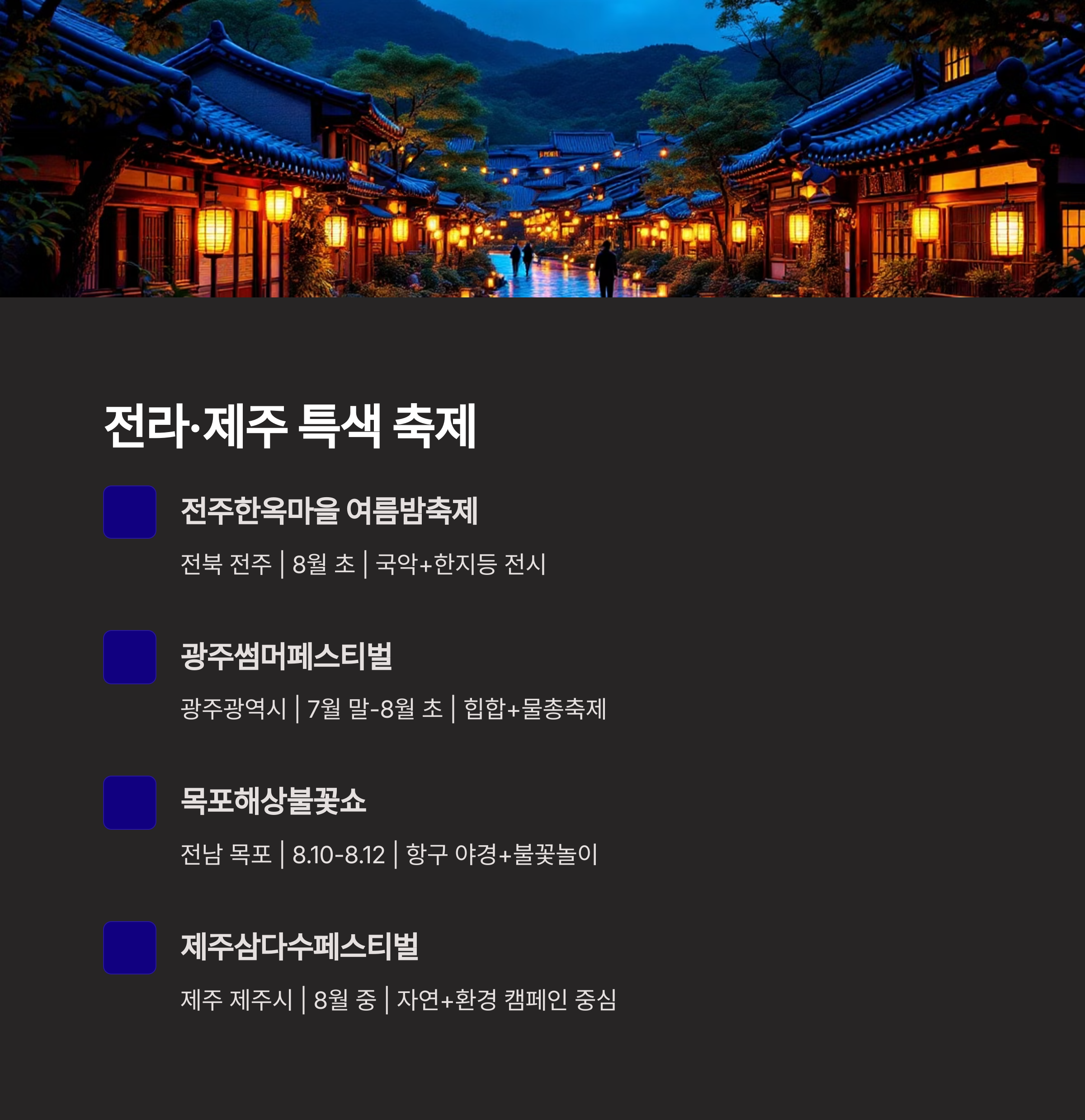 | 전주한옥마을 여름밤축제 | 전북 전주 | 8월 초 | 국악+한지등 전시 |