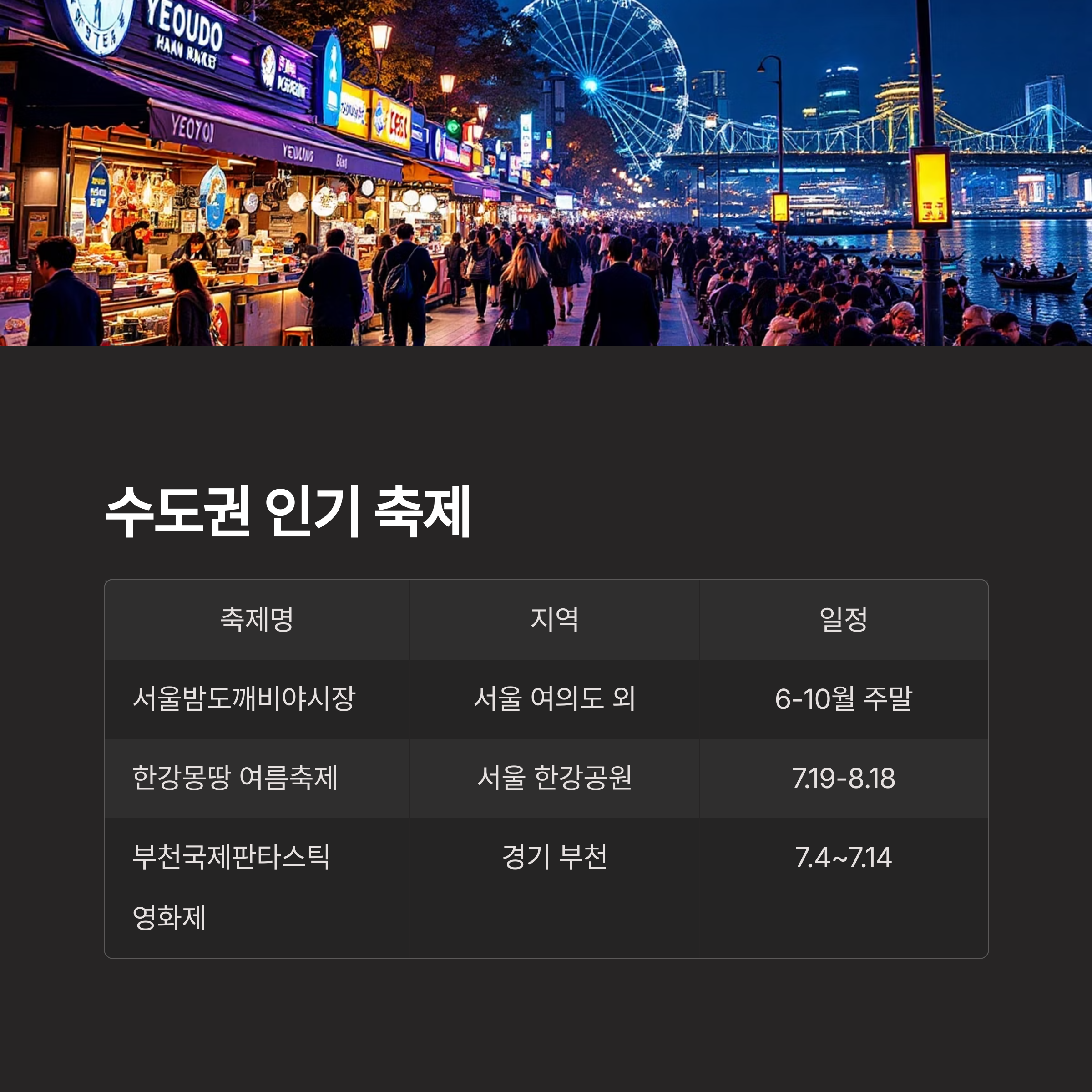 | 서울밤도깨비야시장 | 서울 여의도 외 | 6~10월 주말 | 야시장+공연+푸드트럭 |