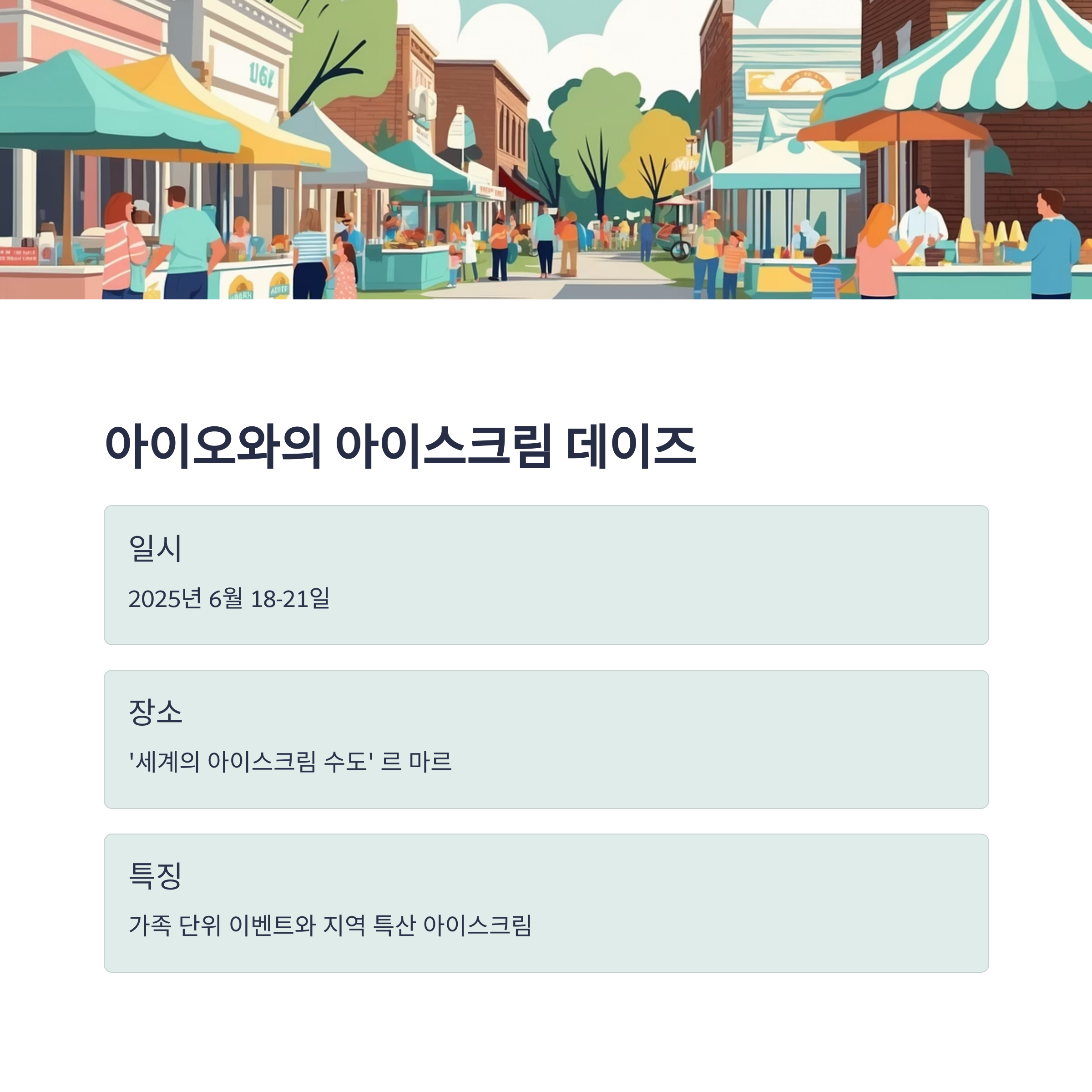 2025년 6월 18일부터 21일까지, '세계의 아이스크림 수도'로 알려진 아이오와 주 르 마르에서 '아이스크림 데이즈' 축제가 개최됩니다. 가족 단위 방문객을 위한 다양한 이벤트와 함께, 지역 특산 아이스크림을 맛볼 수 있는 기회를 제공합니다.