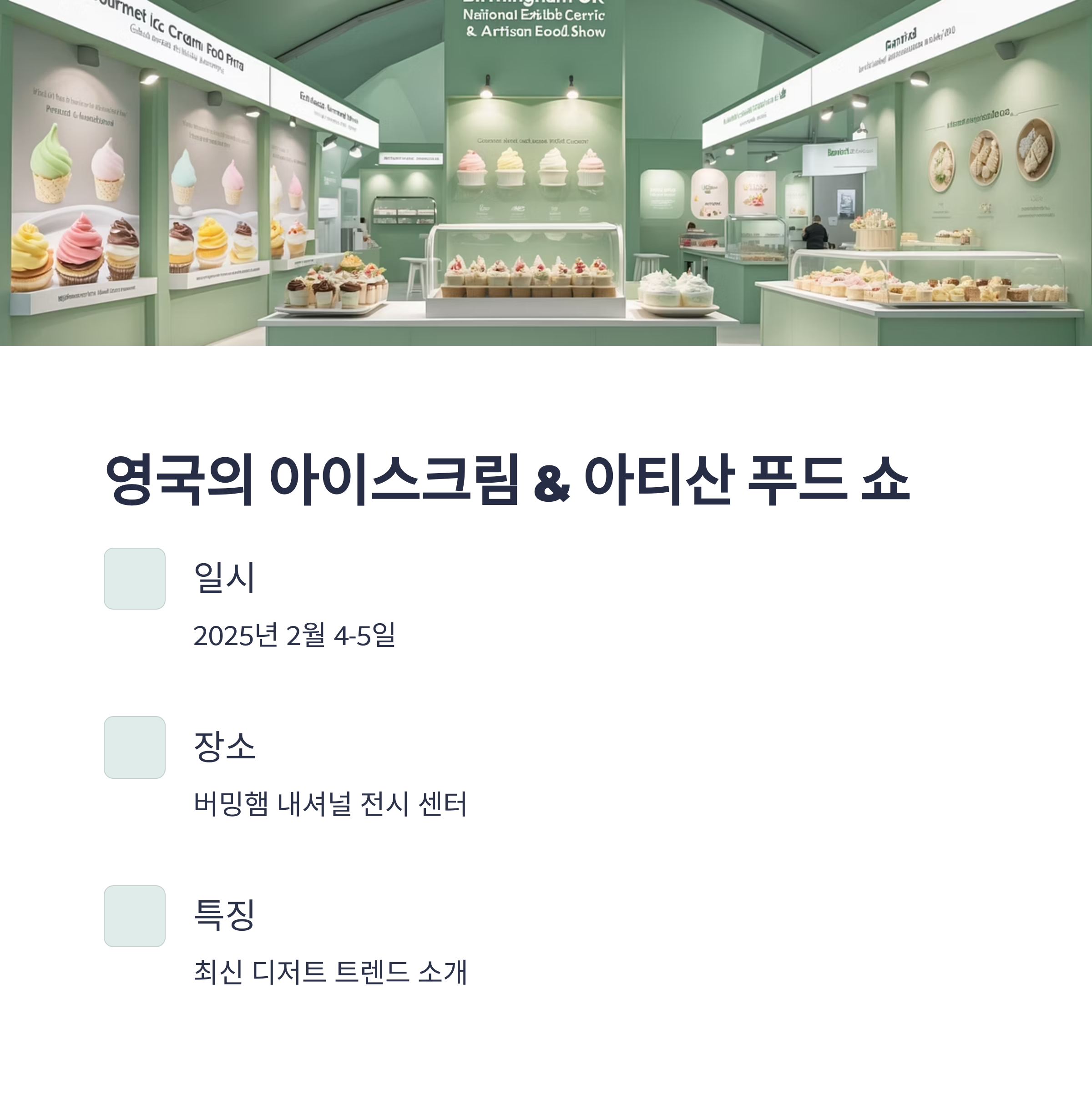 2025년 2월 4일부터 5일까지, 영국 버밍햄의 내셔널 전시 센터에서 '아이스크림 & 아티산 푸드 쇼'가 열립니다. 이 행사는 아이스크림과 수제 음식 애호가들을 위한 최고의 이벤트로, 전 세계 바이어와 제조업체들이 참여하여 최신 디저트 트렌드를 소개합니다.