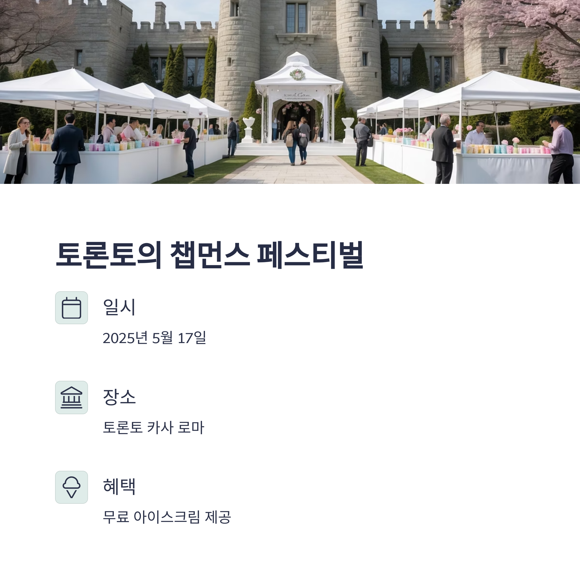 2025년 5월 17일, 토론토의 역사적인 명소 카사 로마에서 '챕먼스 아이스크림 페스티벌'이 처음으로 열립니다. 고급 아이스크림 시식, 아이스크림 테마 공연, 라이브 음악 등 다양한 프로그램이 준비되어 있으며, 입장객에게는 무료 아이스크림이 제공됩니다.