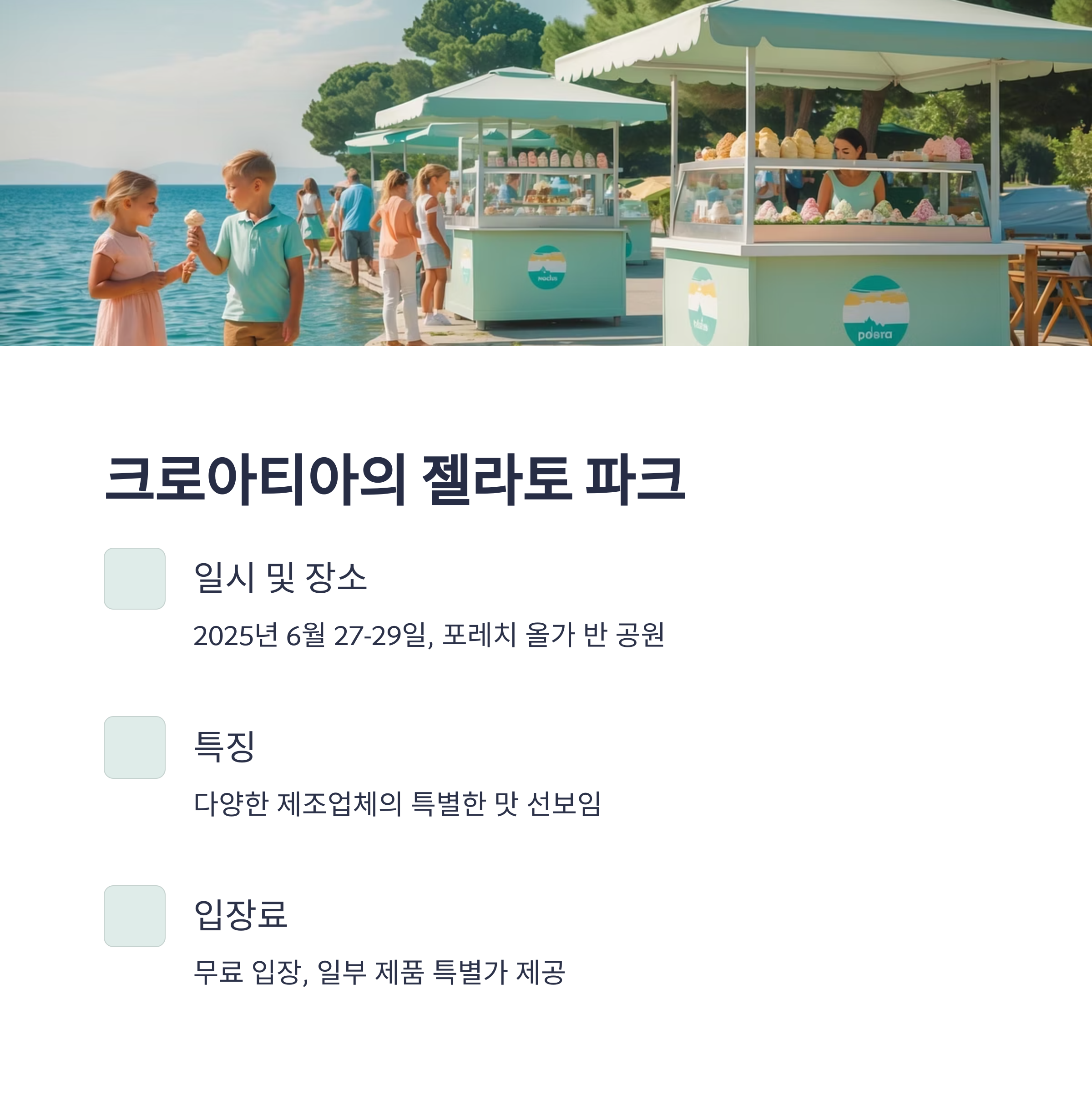 2025년 6월 27일부터 29일까지, 크로아티아 포레치의 올가 반 공원에서 '젤라토 파크 – 아이스크림의 세계' 축제가 열립니다. 이 축제는 모든 세대를 위한 다양한 프로그램과 함께 여러 아이스크림 제조업체들이 참여하여 특별한 맛을 선보입니다. 입장료는 무료이며, 일부 제품은 특별 가격에 제공됩니다.