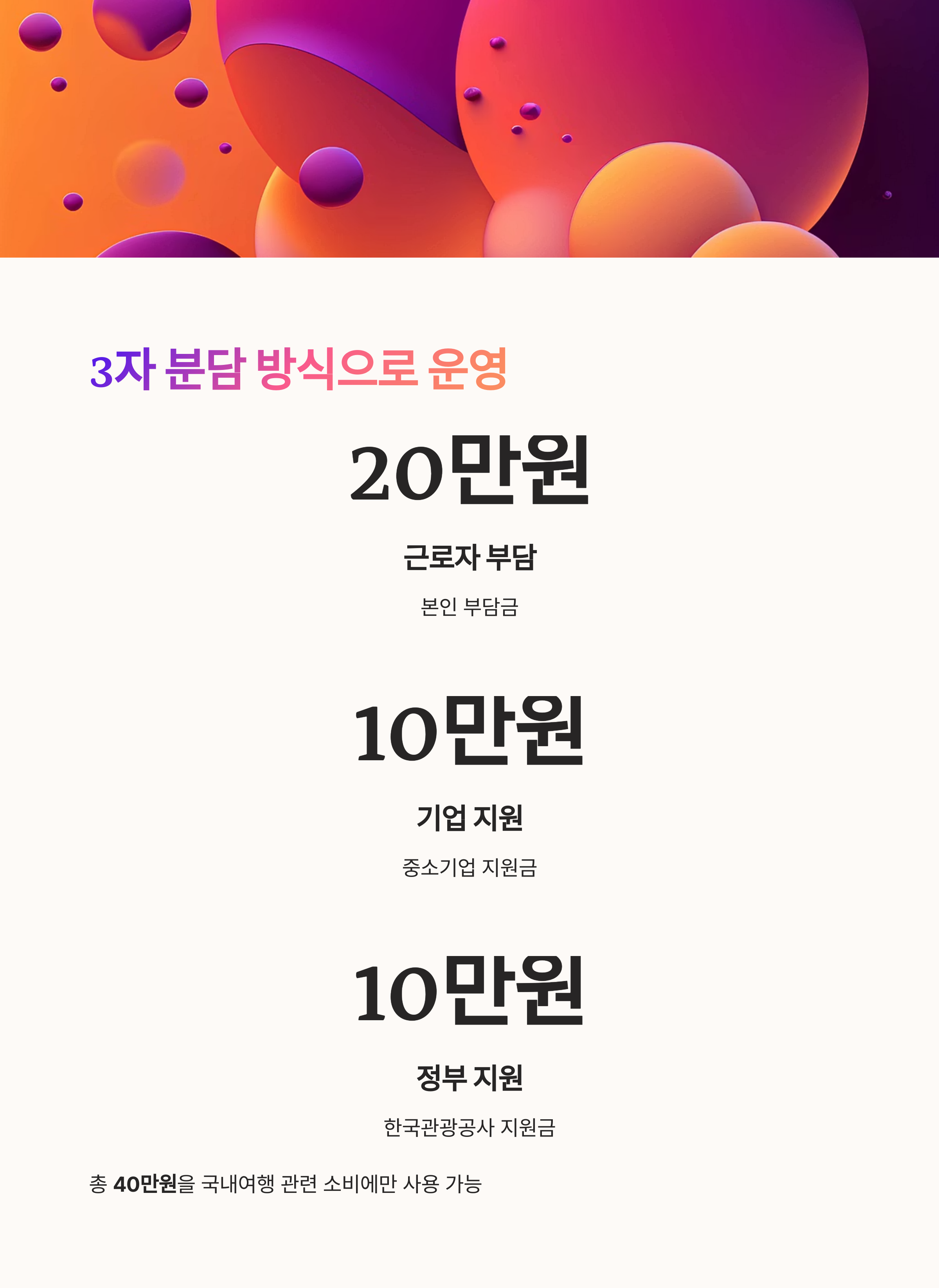 - 지원 내용: 근로자가 20만 원을 적립하면, 기업과 정부가 각각 10만 원을 추가로 적립하여 총 40만 원의 국내 여행 경비 포인트를 제공합니다.