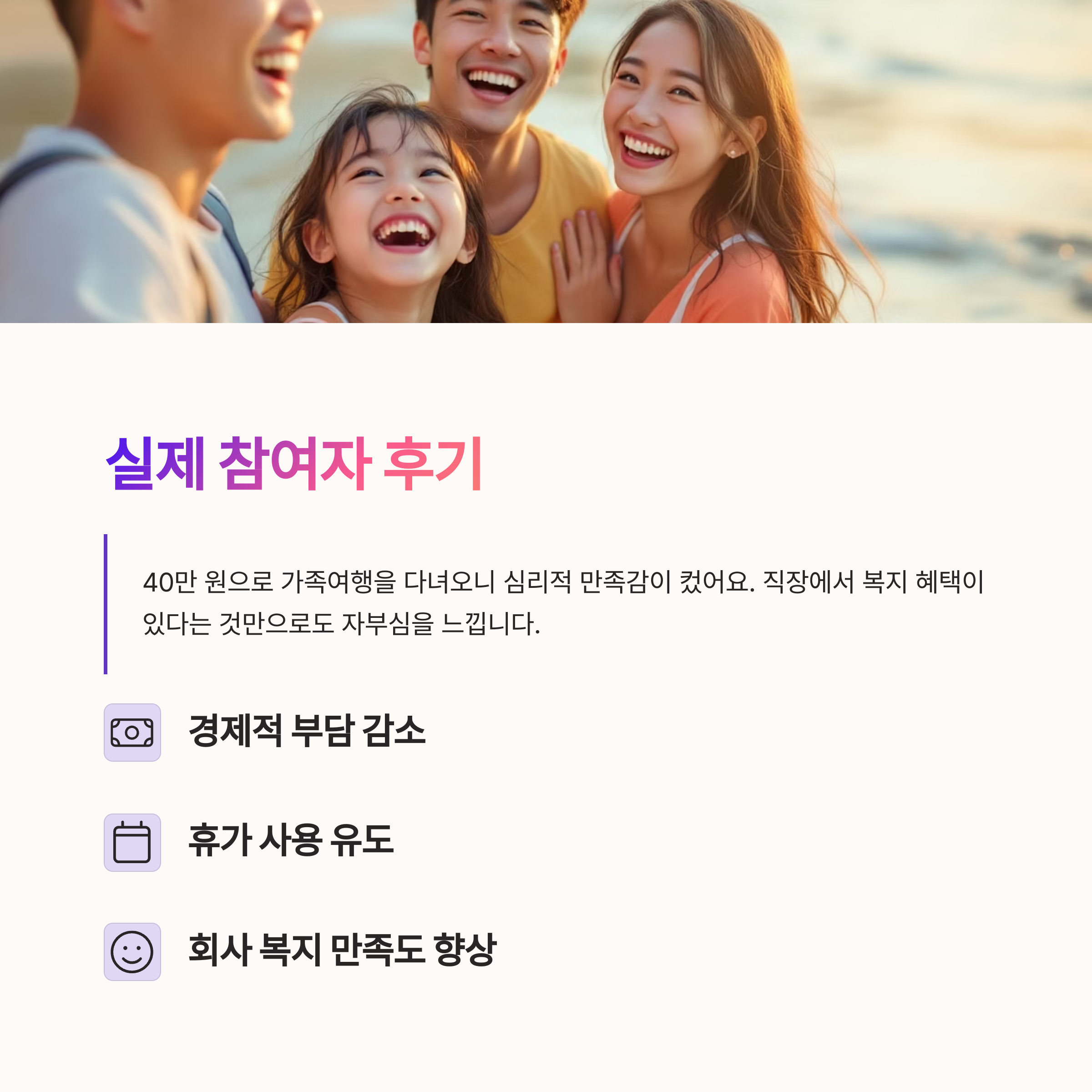 "40만 원으로 가족여행을 다녀오니 심리적 만족감이 컸어요. 직장에서 복지 혜택이 있다는 것만으로도 자부심을 느낍니다."