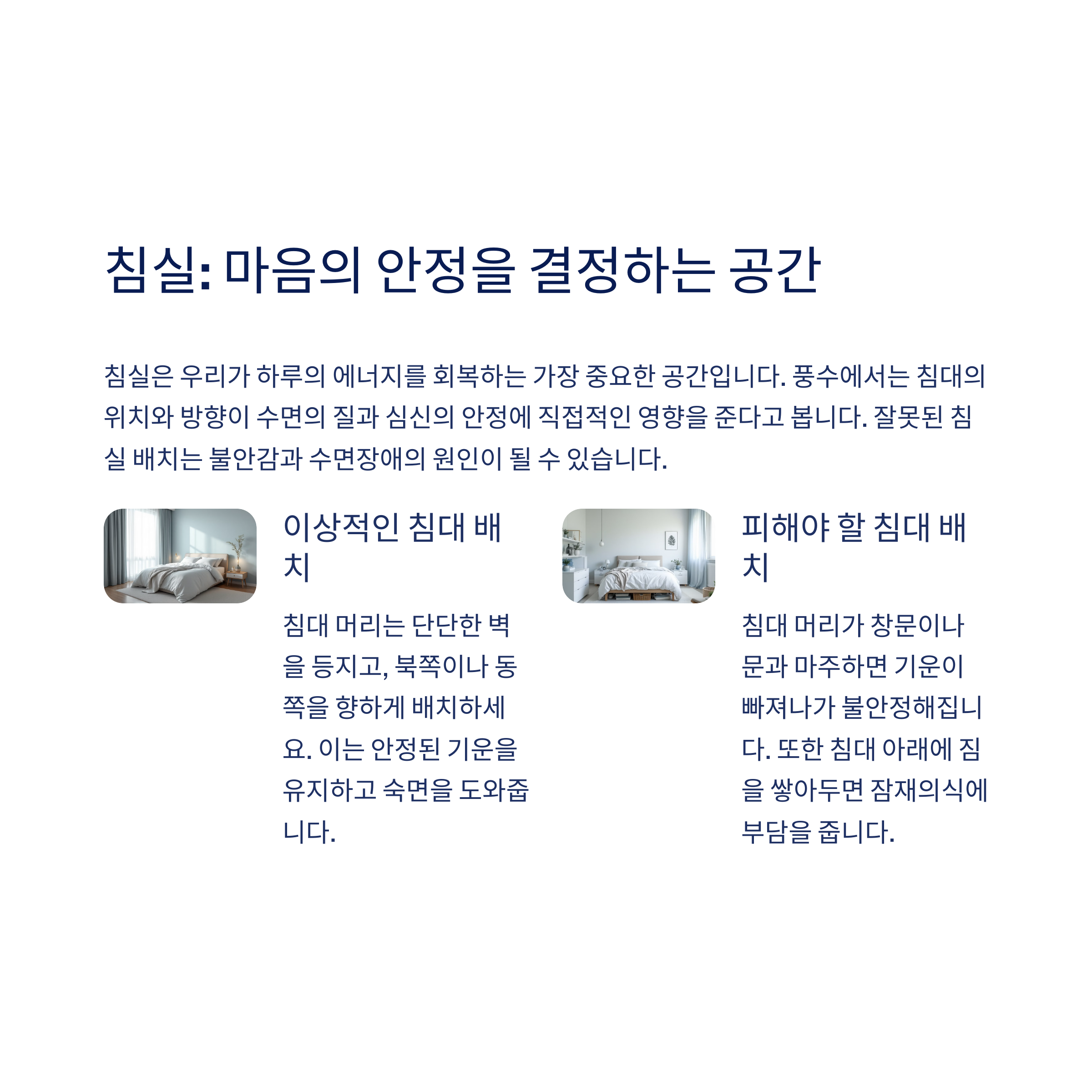 | 침실 | 심신 안정, 수면 질 개선 | 침대 방향 조정, 물건 비우기 |