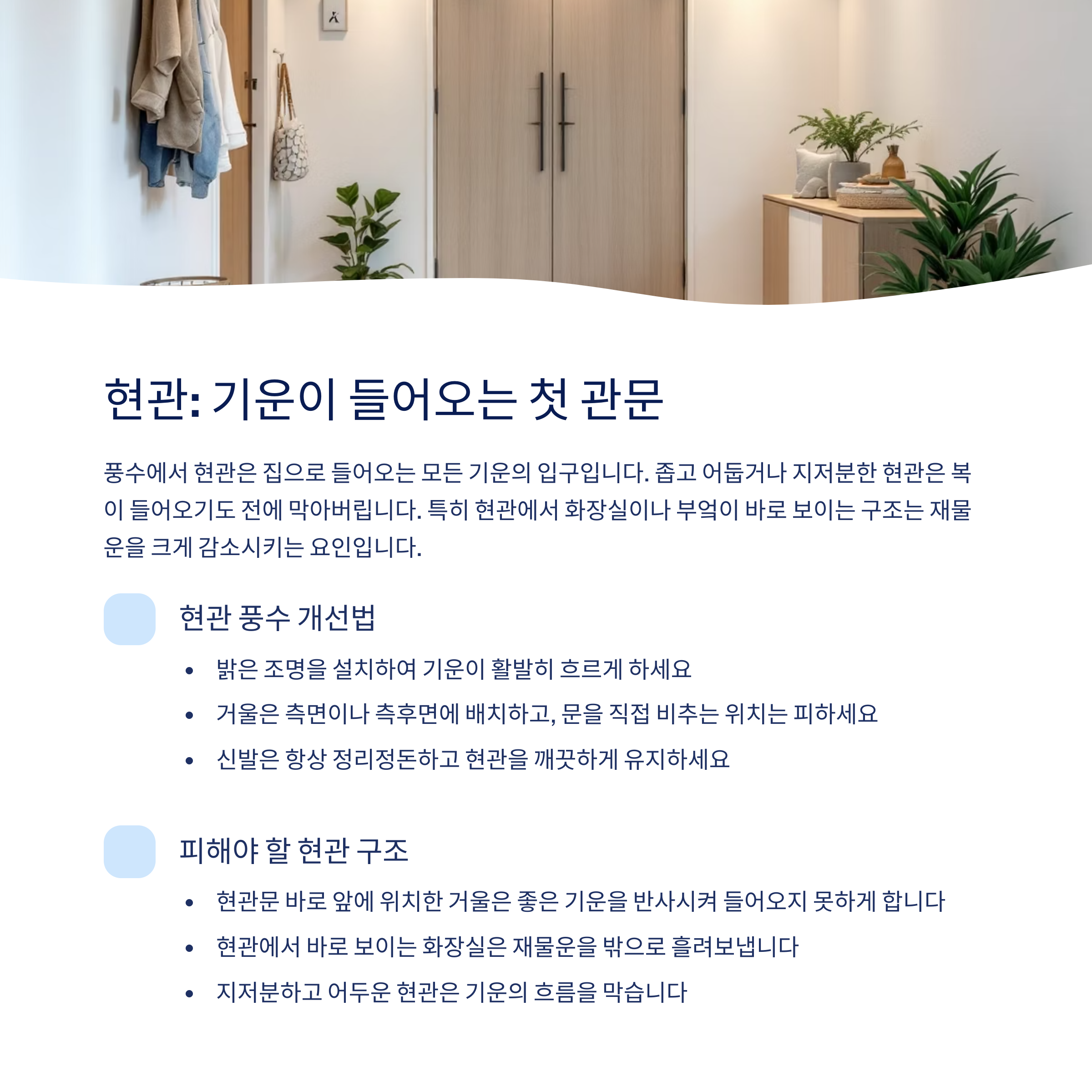 | 현관 | 재물운, 사회적 기운 향상 | 밝은 조명, 깔끔한 정리정돈 |