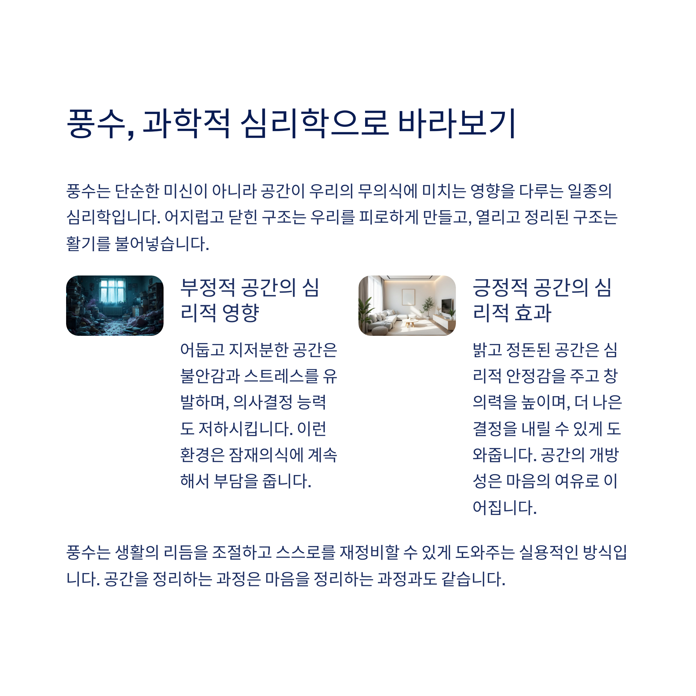 풍수는 단지 미신이 아니라, 우리의 무의식에 영향을 주는 공간 심리학에 가깝습니다.