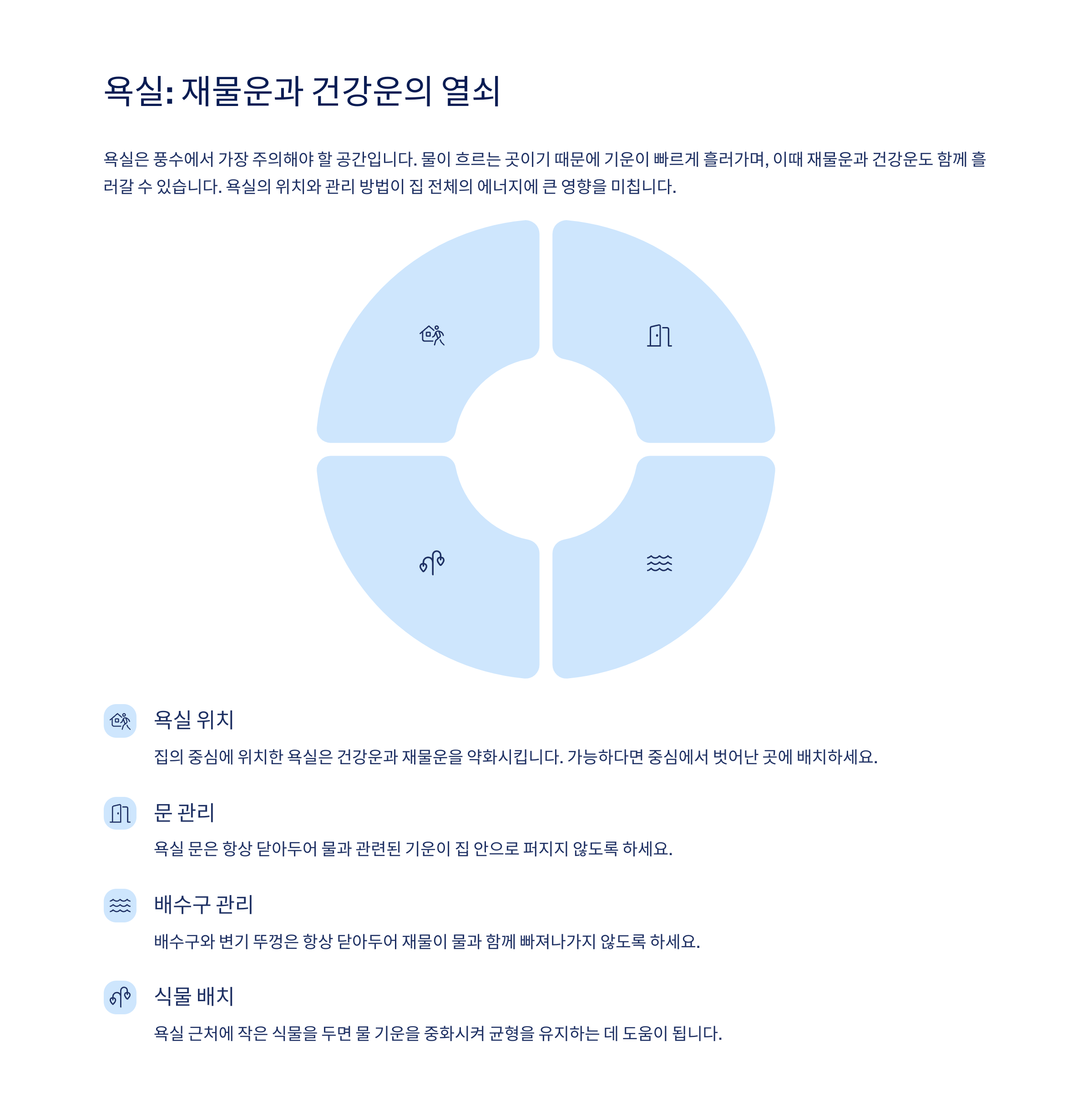 | 욕실 | 건강운, 재물운 보호 | 문 닫기, 배수구/뚜껑 닫기, 식물 놓기 |