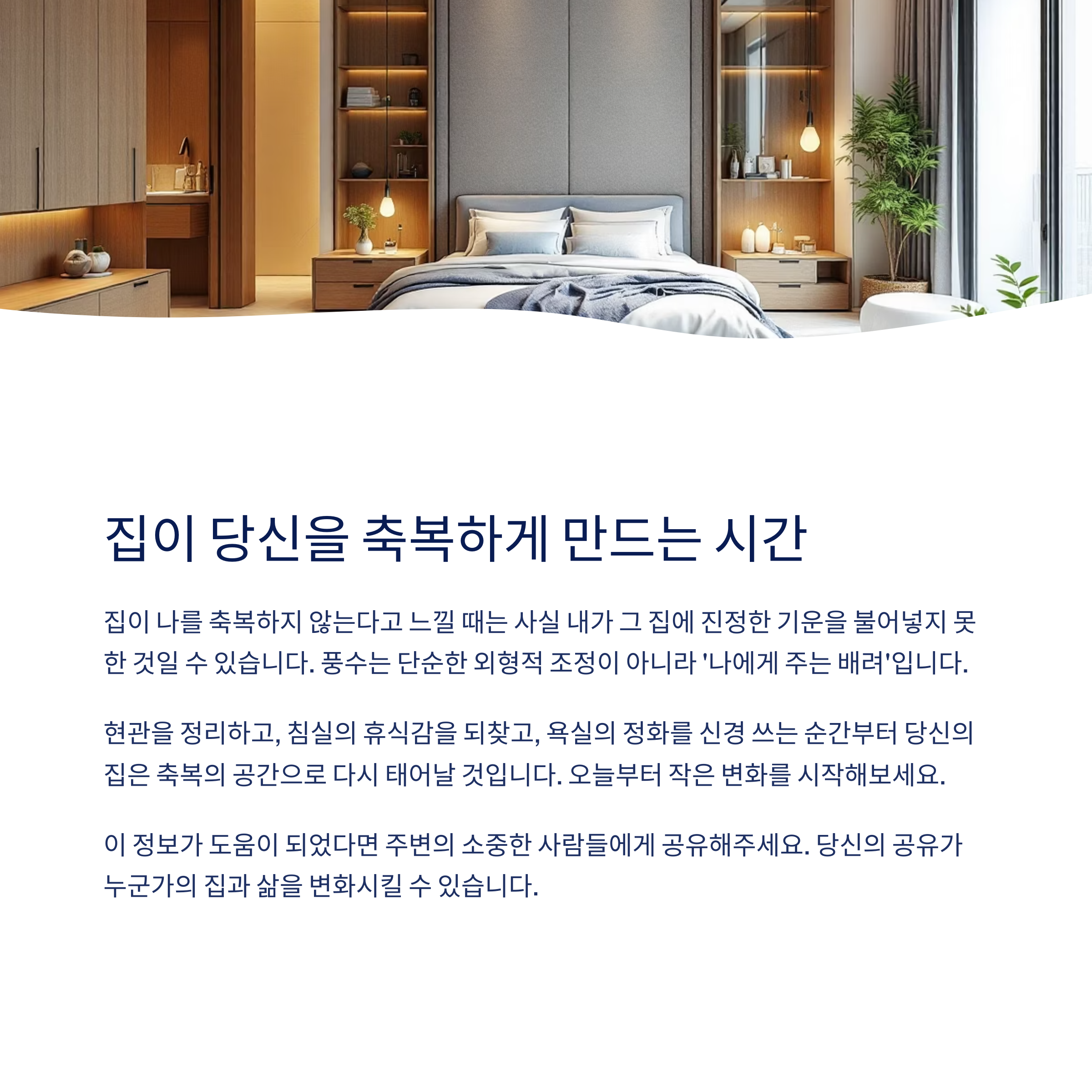 현관을 정리하고, 침실의 휴식감을 되찾고, 욕실의 정화를 신경 쓰는 순간부터 집은 나를 축복하는 공간으로 다시 태어날 것입니다.