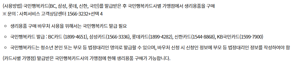 생리용품 바우처는 국민행복카드를 발급받아야 사용 가능하며, 카드사별 가맹점에서 생리용품만 구매 가능(카드사별 구매처가 다르므로 유의, 관련 문의(1566-3232)