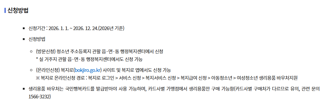 ※ 복지로 온라인신청 경로: 복지로 로그인> 서비스신청> 복지서비스 신청> 복지급여 신청> 아동청소년> 여성청소년 생리용품 바우처 지원