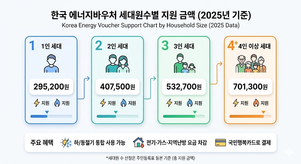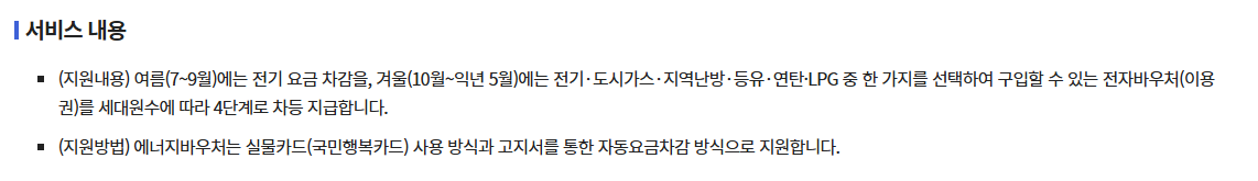 여름(7~9월)에는 전기요금 차감을 , 겨울(10월~다음해5월)에는 전기 및 도시가스,지역난방, 등유,연탄,LPG 중 한가지를 선택하여 구입할 수 있는 전자바우처(이용권)을 세대원수에 따라 4단계로 차등 지급합니다.