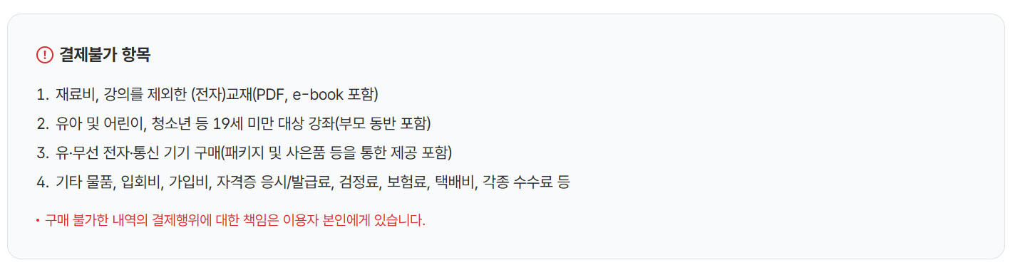 이 부분에서 가장 많은 실수가 발생합니다. 결제 불가 항목을 구매할 경우 환불이 어려울 수 있으니 반드시 확인하세요.