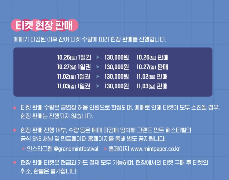 티켓 판매 수량은 공연장 허용 인원으로 한정되며, 예매로 인해 티켓이 모두 소진될 경우에는 현장 판매는 진행하지 않는다고 해요. 현장 판매 진행 여부, 수량 등은 예매 마감에 임박해 그랜드 민트 페스티벌의 공식 SNS 채널 및 민트페이퍼 홈페이지를 통해 별도 공지된다고 하니 참고하세요!!