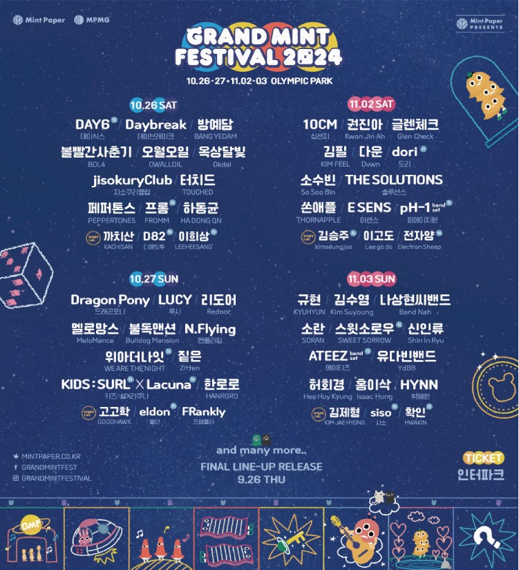 그랜드 민트 페스티벌 2024는 10월 26일(토)부터 11월 3일(일)까지 2주간에 걸쳐 진행합니다. 10월 마지막주와 11월 첫째 주 주말 올림픽공원에서 개최됩니다. 티켓 부스 오픈 및 입장 시작 시간은 추후 공개되는 타임테이블을 통해 안내될 예정입니다.