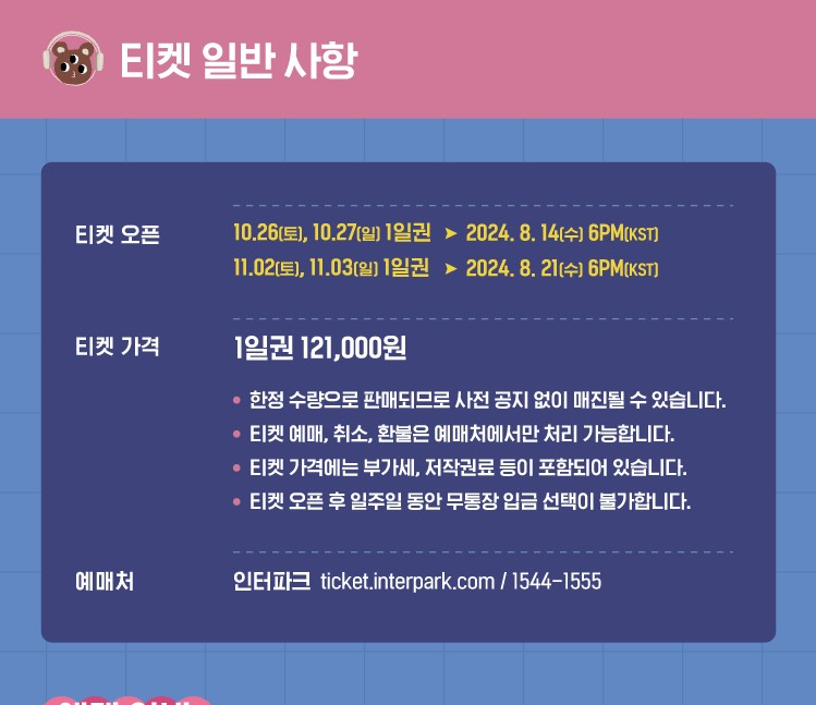 ※ 기타 자세한 예매 및 티켓 수령, 입장 관련 사항은 아래 상세 내용을 확인하시기 바랍니다.