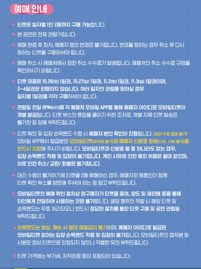 * 주의 사항 : 예매자 아이디로 발급된 모바일티켓(캡처본 불가)과 실물 신분증(사진, 사본 불가) 모두 지참하여야 입장 손목밴드 착용 및 입장 가능